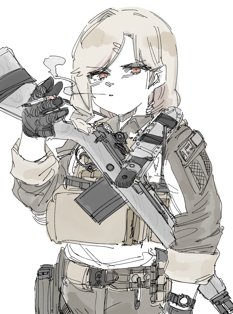 1girl belt black_gloves blonde_hair gloves gun highres looking_at_viewer military orange_eyes pouch red_eyes rifle samsick short_hair simple_background smoking solo utility_belt vest weapon white_background