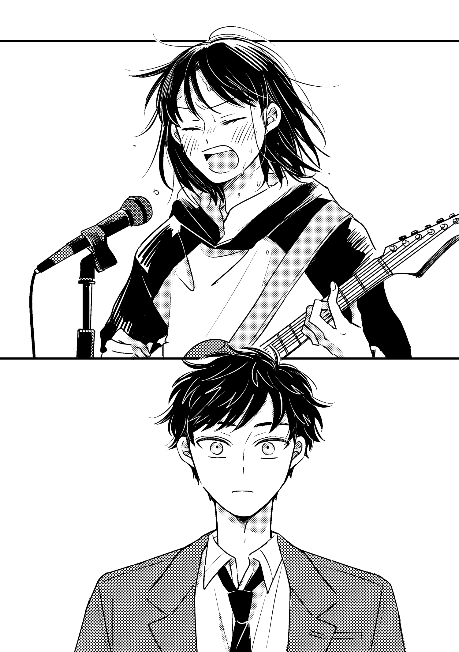 1boy 1girl :o blazer blush cable closed_eyes closed_mouth collared_shirt commentary_request electric_guitar futsuu_no_keion-bu greyscale guitar guitar_strap hatono_chihiro highres holding holding_guitar holding_instrument hood hood_down instrument jacket lapels microphone microphone_stand mizuo_haruichi monochrome music necktie notched_lapels official_alternate_costume robomi school_uniform shirt short_hair simple_background singing upper_body white_background wide-eyed