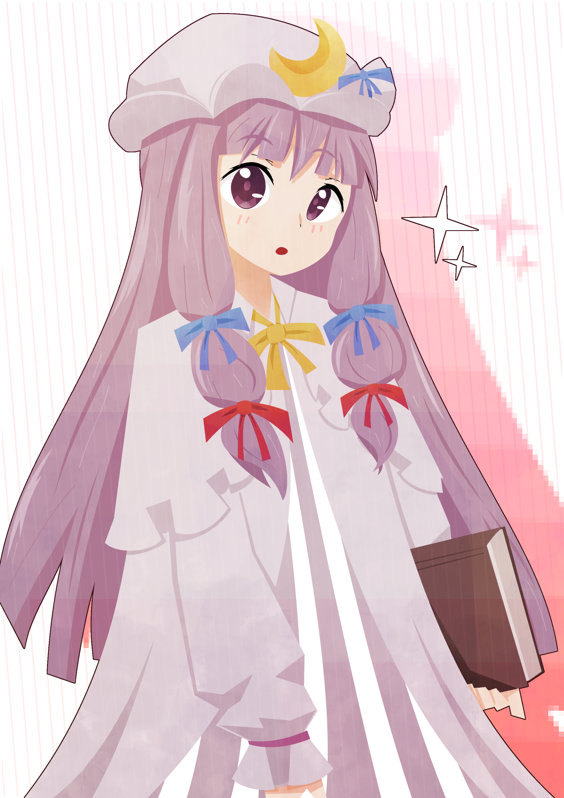 1girl absurdres book commentary crescent crescent_hat_ornament dress english_commentary hat hat_ornament highres holding holding_book long_hair looking_at_viewer mob_cap open_mouth patchouli_knowledge pink_dress pink_hat purple_eyes purple_hair rollanan sidelocks solo touhou