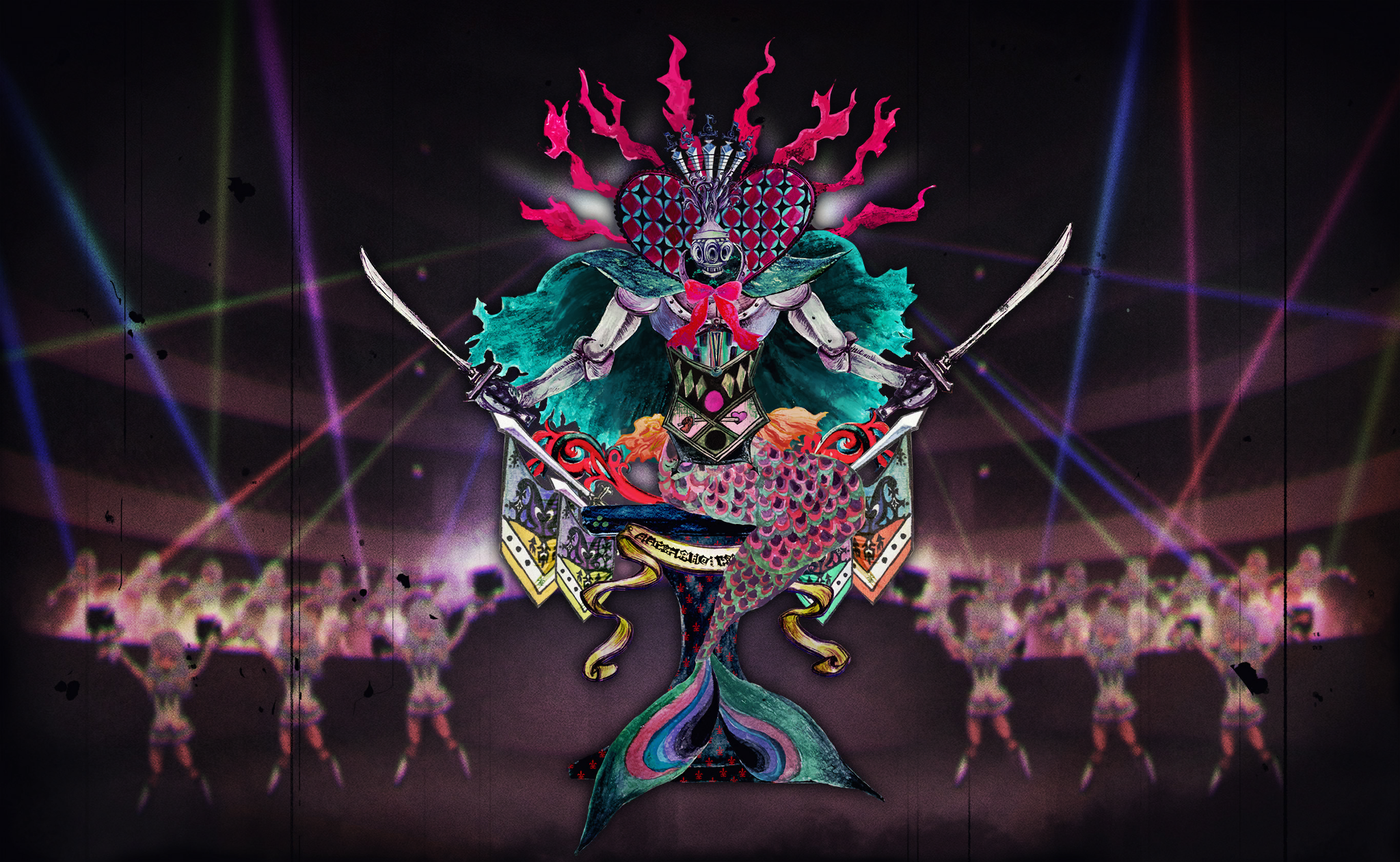 artist_request cape creature creature_focus dual_wielding familiar_(madoka_magica) film_grain game_cg helm helmet highres holding holding_sword holding_weapon klarissa_(madoka_magica) magia_record:_mahou_shoujo_madoka_magica_gaiden mahou_shoujo_madoka_magica mahou_shoujo_madoka_magica_magia_exedra mermaid monster_girl no_humans official_alternate_color official_art oktavia_von_seckendorff sitting stage stage_lights sword torn_cape torn_clothes weapon witch's_labyrinth witch_(madoka_magica)