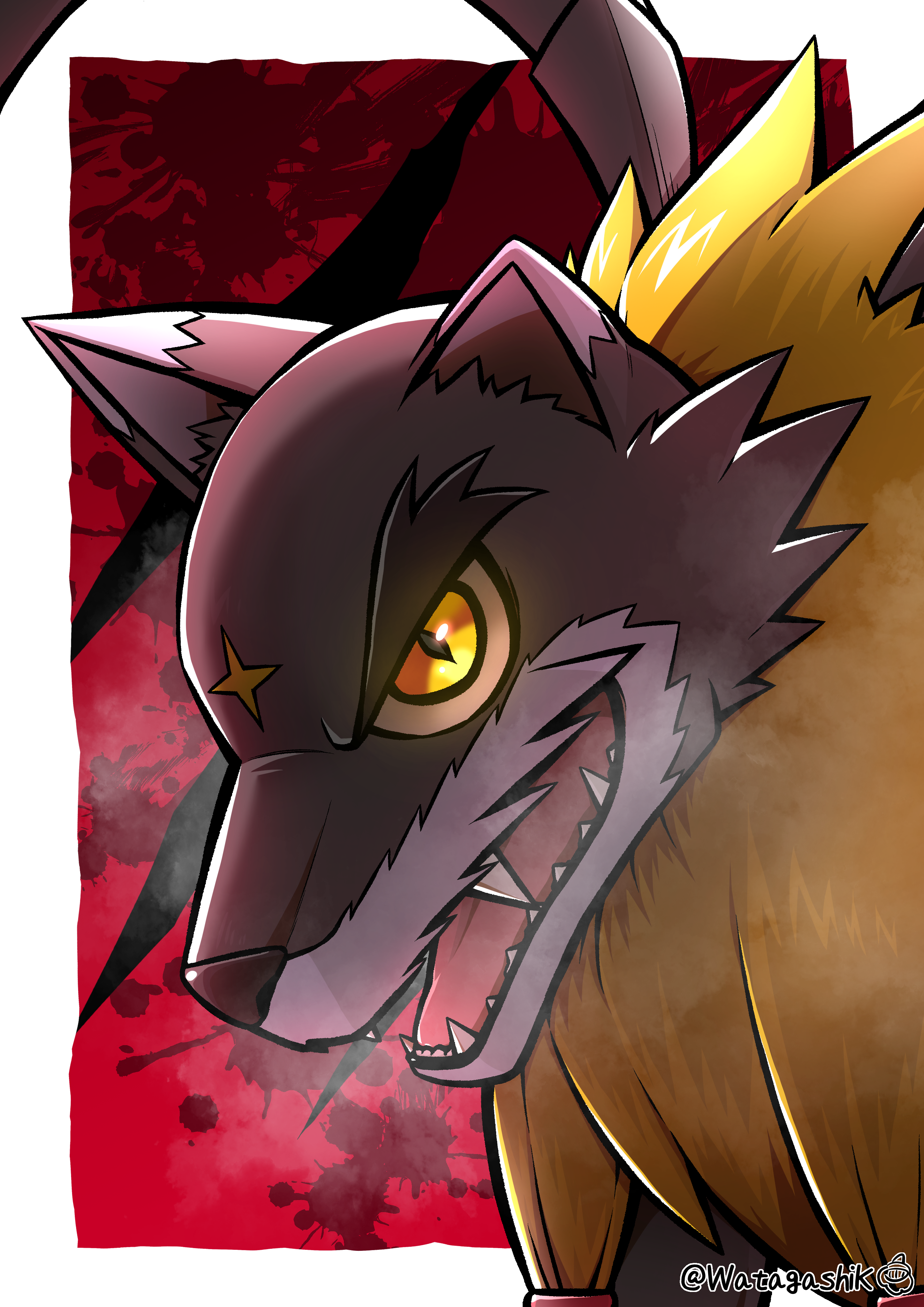 absurdres animal_ears animal_nose black_fur blackgaogamon body_fur border commentary_request cross_scar digimon digimon_(creature) dog_ears fangs from_side furry highres open_mouth outside_border profile red_background scar scar_on_face scar_on_forehead sharp_teeth signature solo teeth thick_eyebrows twitter_username two-tone_fur upper_body watagashikn white_border yellow_eyes yellow_fur