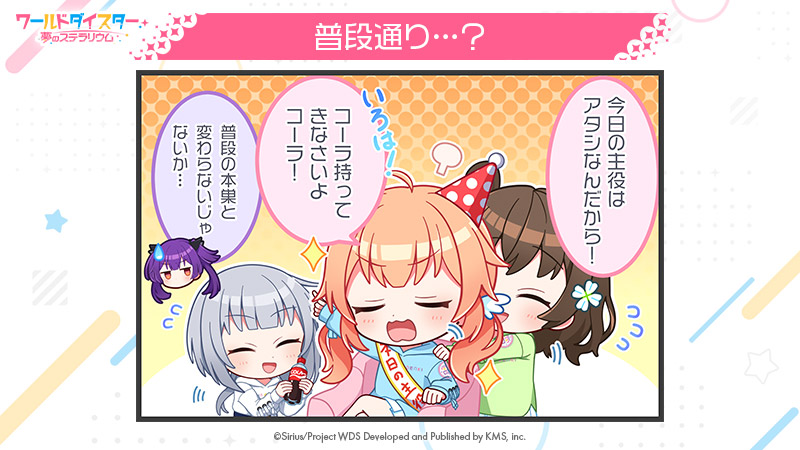 >_< 3girls ^_^ ahoge blush bow brown_hair chibi closed_eyes commentary_request flower flying_sweatdrops grey_hair hair_bow hair_flower hair_ornament heart hood hood_down jacket japanese_clothes kimono long_hair long_sleeves motosu_towa multicolored_hair multiple_girls nekoashi_tsubomi official_art open_mouth orange_hair polka_dot polka_dot_background polka_dot_bow purple_hair second-party_source senju_iroha shiromaru_mito short_hair smile translation_request twintails world_dai_star