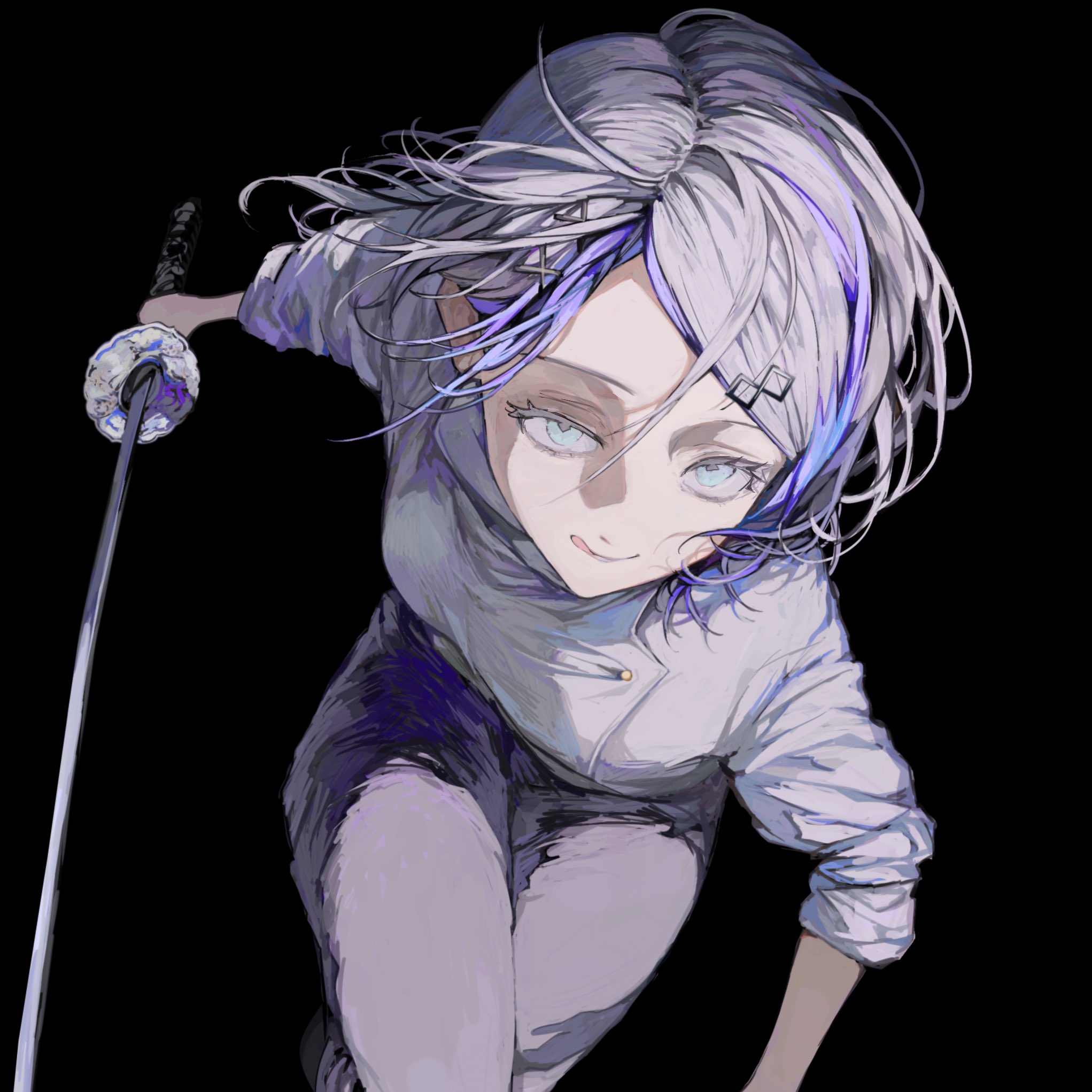 1girl alternate_costume alternate_hairstyle black_background black_pants blue_eyes closed_mouth cosplay cowboy_shot dynamic_pose empty_eyes fighting_stance floating_hair forehead grey_hair grey_jacket hair_ornament hairclip highres holding holding_sword holding_weapon jacket jujutsu_tech_uniform katana licking_lips looking_at_viewer medium_hair million_production multicolored_hair nonono_nono official_art ofgwr pants purple_hair second-party_source side_part sleeves_rolled_up smile smirk solo streaked_hair sword tongue tongue_out two-tone_hair virtual_youtuber weapon