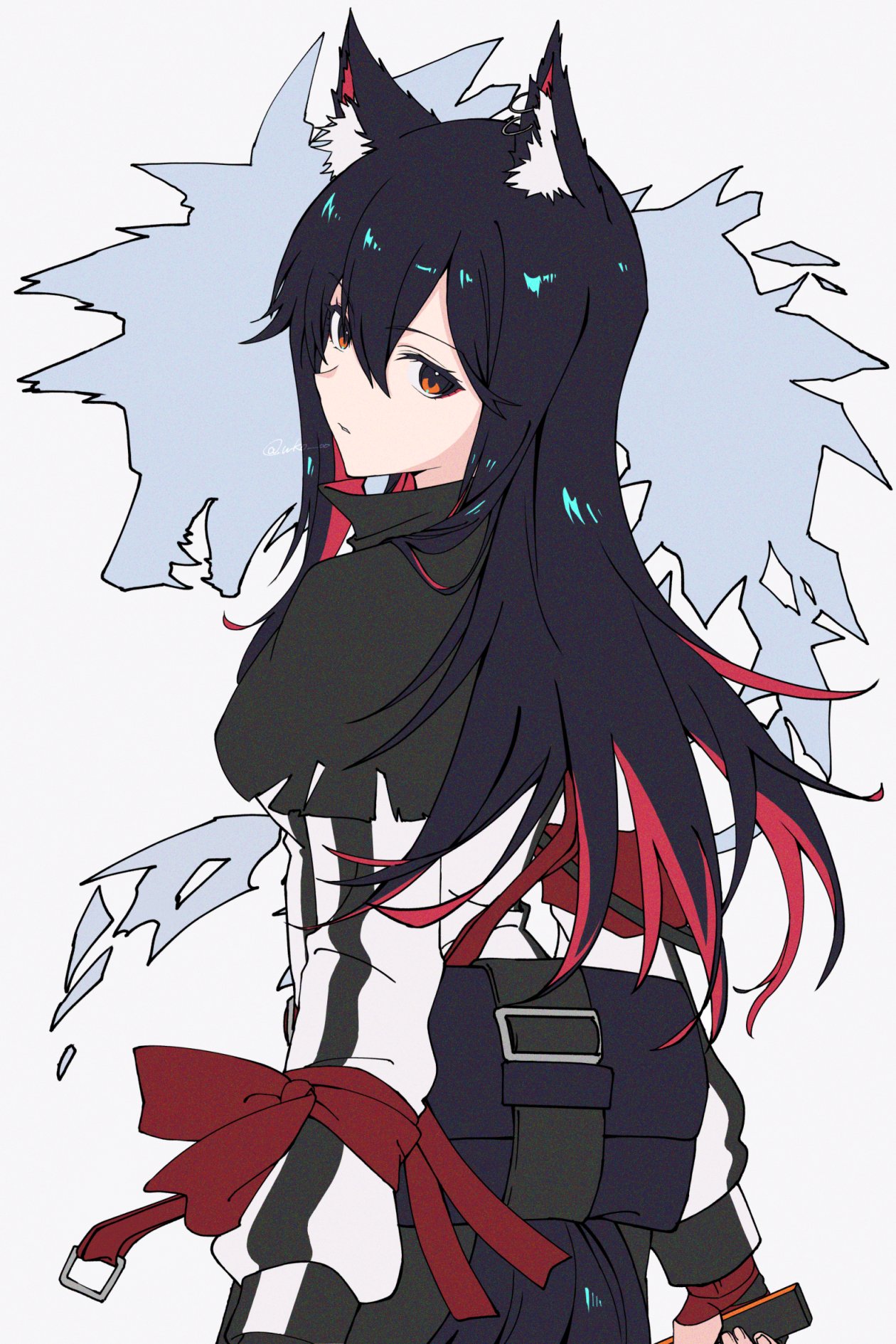 1girl animal_ear_fluff animal_ears arknights artist_name black_capelet black_hair black_jacket brown_eyes capelet closed_mouth commentary_request from_behind hair_between_eyes head_tilt highres holding holding_sword holding_weapon jacket konota_ko long_sleeves looking_at_viewer multicolored_hair multicolored_jacket red_hair simple_background solo sword texas_(arknights) two-tone_hair two-tone_jacket upper_body weapon white_background white_jacket wolf_ears wolf_girl