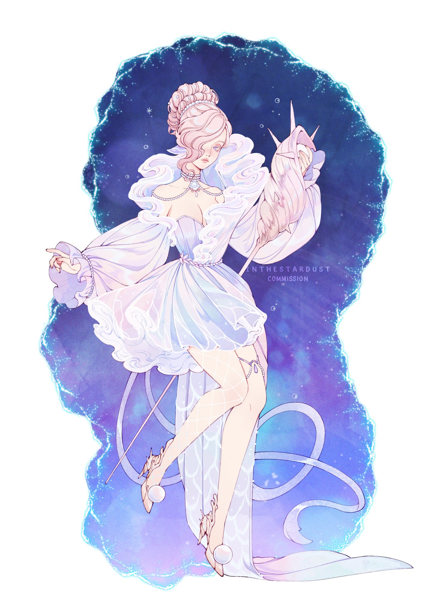 1girl artist_name bare_shoulders braid breasts character_request choker cleavage commission copyright_request dress eyeshadow frilled_sleeves frills full_body gem hair_bun hair_over_one_eye high_heels highres holding holding_staff inthestardust jewelry long_sleeves makeup medium_breasts necklace pantyhose pearl_(gemstone) pink_hair pom_pom_(clothes) puffy_long_sleeves puffy_sleeves see-through_clothes single_hair_bun solo staff star_(sky) strapless strapless_dress white_background
