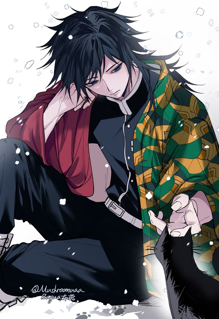 1boy belt black_cat black_hair black_jacket black_pants blue_eyes buttons cat closed_mouth demon_slayer_uniform fingernails hair_between_eyes half-closed_eyes haori head_rest high_collar jacket japanese_clothes kikkoumon kimetsu_no_yaiba long_hair looking_down low_ponytail male_focus mushroomuaa pants ponytail print_haori red_haori sitting snow solo spiked_hair tomioka_giyuu twitter_username veins veiny_hands white_background white_belt