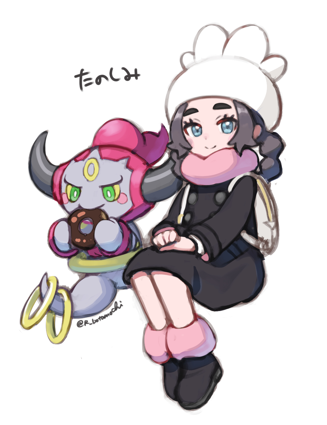 1girl ansha_(pokemon) black_coat black_dress botamochi_(exwelder) closed_mouth coat coat_dress donut dress eyelashes food gen_6_pokemon grey_hair hat highres holding holding_donut holding_food hoopa hoopa_(confined) invisible_chair legendary_pokemon long_sleeves looking_at_viewer mythical_pokemon nintendo pokemon pokemon_(creature) pokemon_legends:_z-a sitting smile twitter_username white_background white_hat