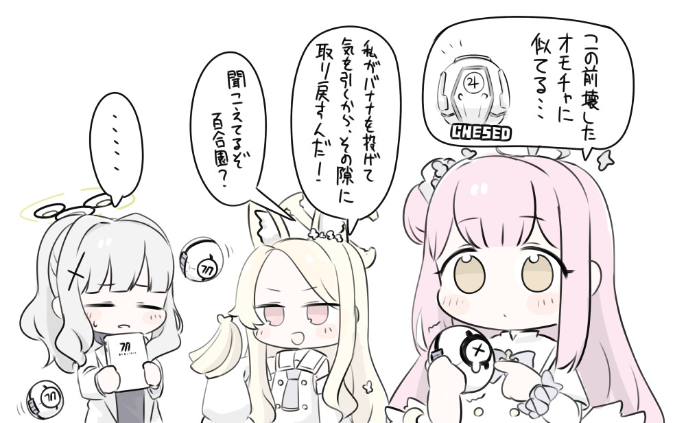 3girls :d banana black_shirt blonde_hair blue_archive blush_stickers bow brown_eyes chesed_(blue_archive) chibi closed_eyes detached_sleeves dress food forehead fruit grey_hair halo hare_(blue_archive) holding holding_food lab_coat long_hair long_sleeves mika_(blue_archive) miranofuudoria multiple_girls open_clothes open_mouth parted_bangs parted_lips pink_eyes pink_hair ponytail puffy_long_sleeves puffy_sleeves purple_bow robot seia_(blue_archive) shirt simple_background sleeves_past_fingers sleeves_past_wrists small_sweatdrop smile sweat teardrop translation_request trembling very_long_hair white_background white_dress white_sleeves