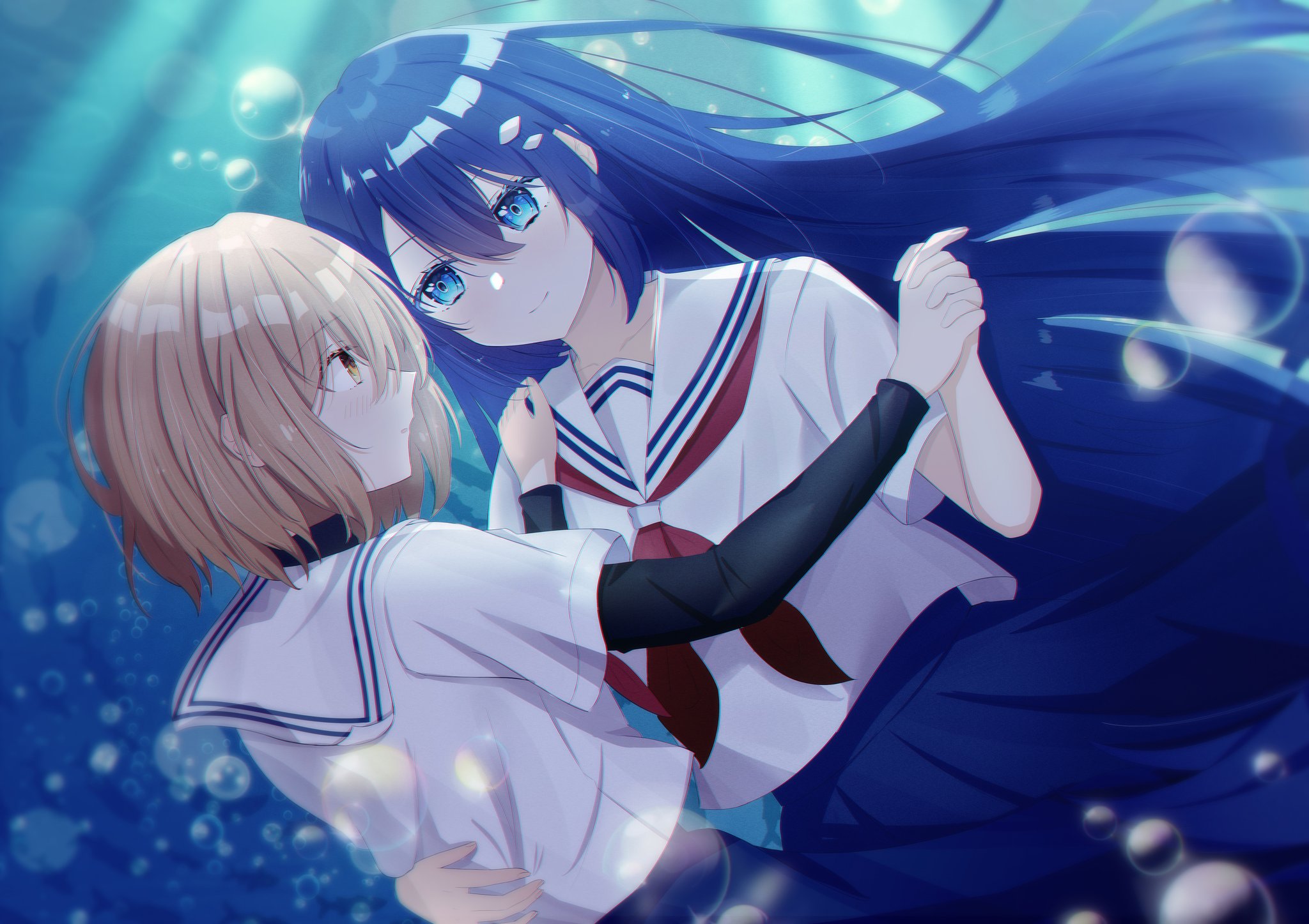 2girls air_bubble blue_eyes blue_hair brown_eyes brown_hair bubble closed_mouth commentary hair_ornament hand_on_another's_shoulder hand_on_another's_waist highres interlocked_fingers long_hair looking_at_another moxuebaichen1 multiple_girls neckerchief oumi_shiori red_neckerchief sailor_collar school_uniform serafuku shirt short_hair short_sleeves skirt smile untranslatable_commentary undershirt underwater watashi_wo_tabetai_hitodenashi white_sailor_collar white_shirt yaotose_hinako yellow_eyes yuri