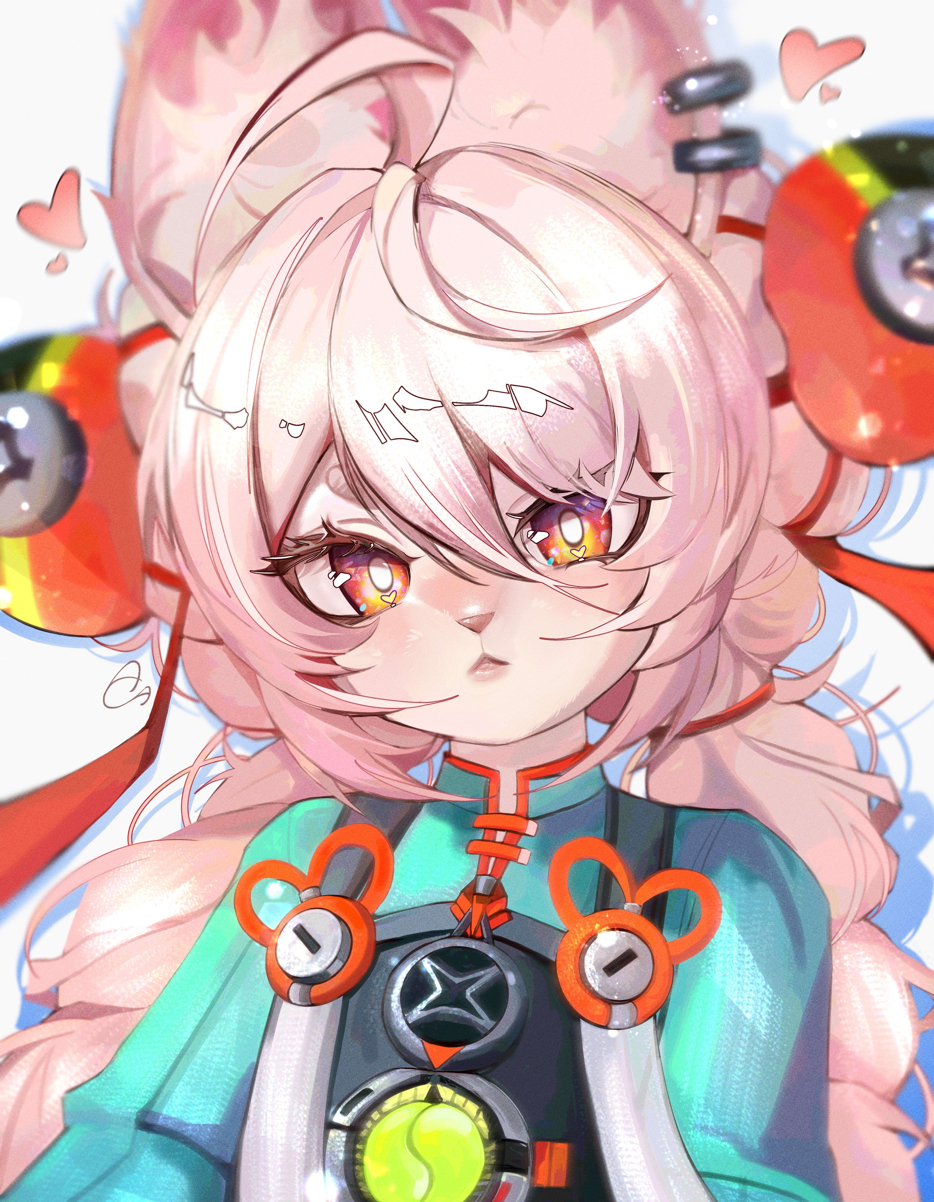 1girl :< absurdres aiotsushu animal_ear_fluff animal_ear_piercing animal_ears braid braided_twintails bright_pupils chinese_clothes closed_mouth commentary furry furry_female green_shirt heart heart_in_eye highres long_hair looking_at_viewer medallion pink_fur pink_hair portrait rabbit_ears rabbit_girl red_eyes screw shirt short_eyebrows simple_background solo untranslatable_commentary symbol_in_eye thick_eyebrows white_background white_pupils zenless_zone_zero zhao_(zenless_zone_zero)