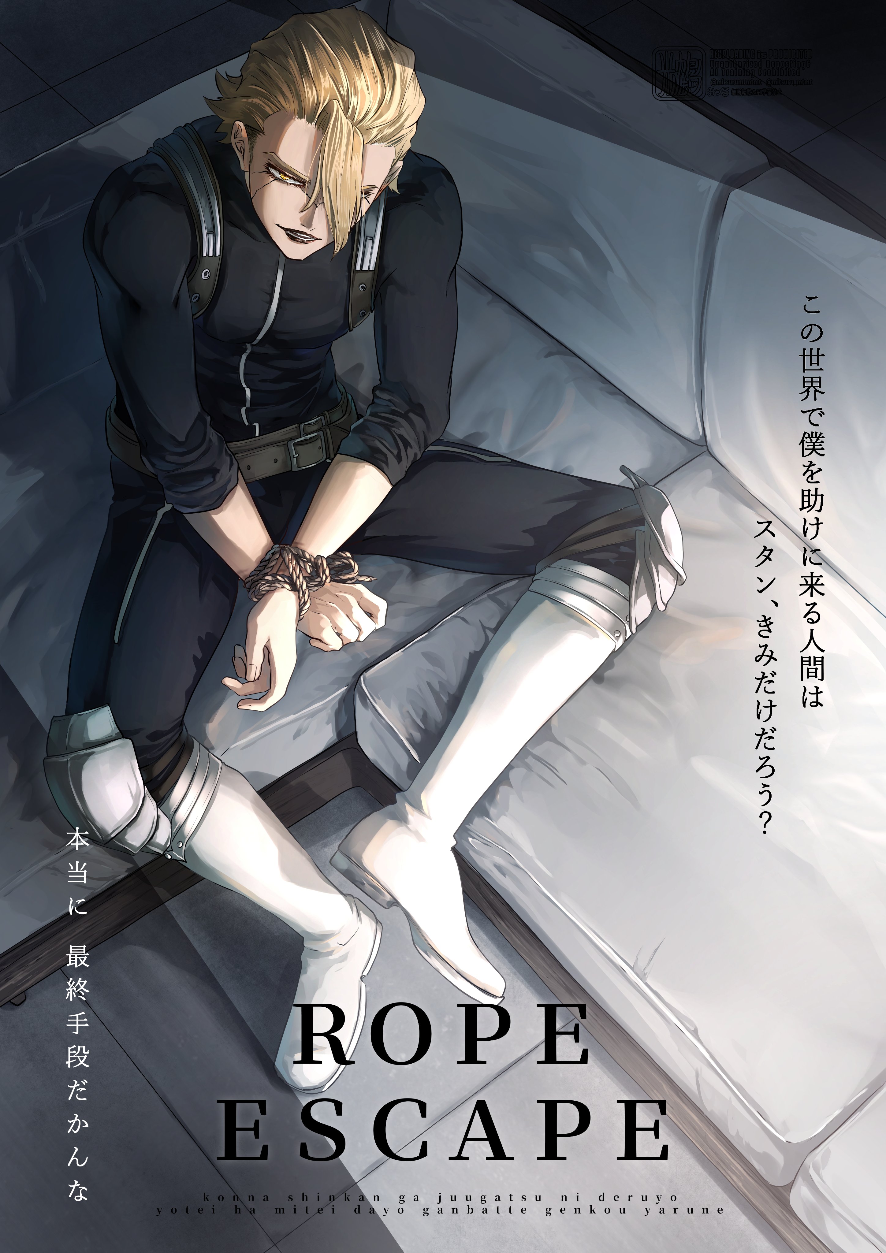 1boy absurdres belt black_pants black_shirt blonde_hair boots bound bound_wrists copyright_name couch dr._stone from_above full_body hair_over_one_eye highres indoors knee_boots knee_pads looking_at_viewer male_focus mitsuru_(aica_hikari) open_mouth pants rope shirt short_hair sitting sleeves_rolled_up solo stanley_snyder_(dr.stone) yellow_eyes
