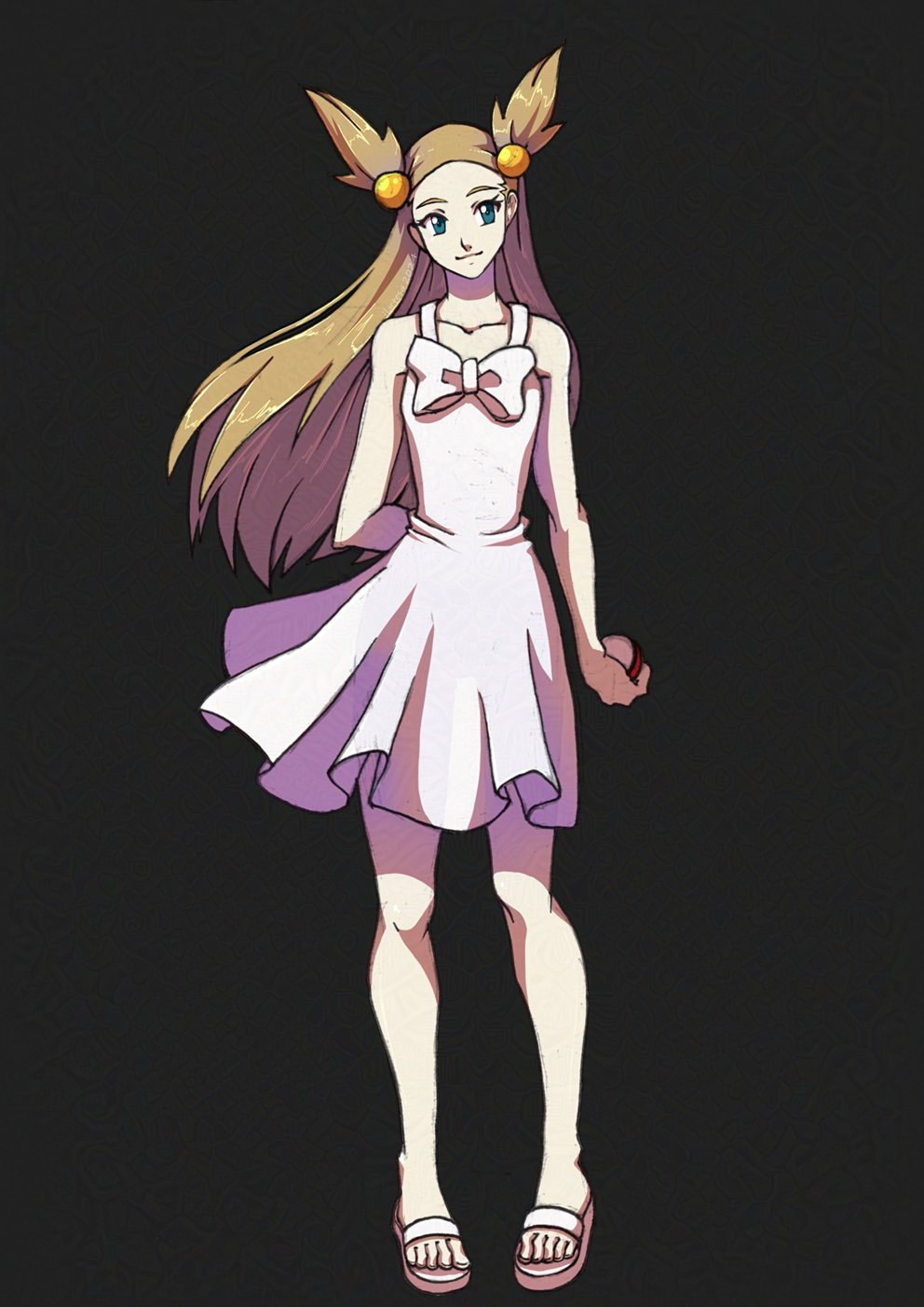 1girl arm_behind_back black_background brown_hair collared_shirt dress full_body hair_bobbles hair_ornament hartesa highres holding holding_poke_ball jasmine_(pokemon) nintendo poke_ball poke_ball_(basic) pokemon pokemon_gold/silver/crystal sandals shirt sleeveless sleeveless_dress solo standing sundress