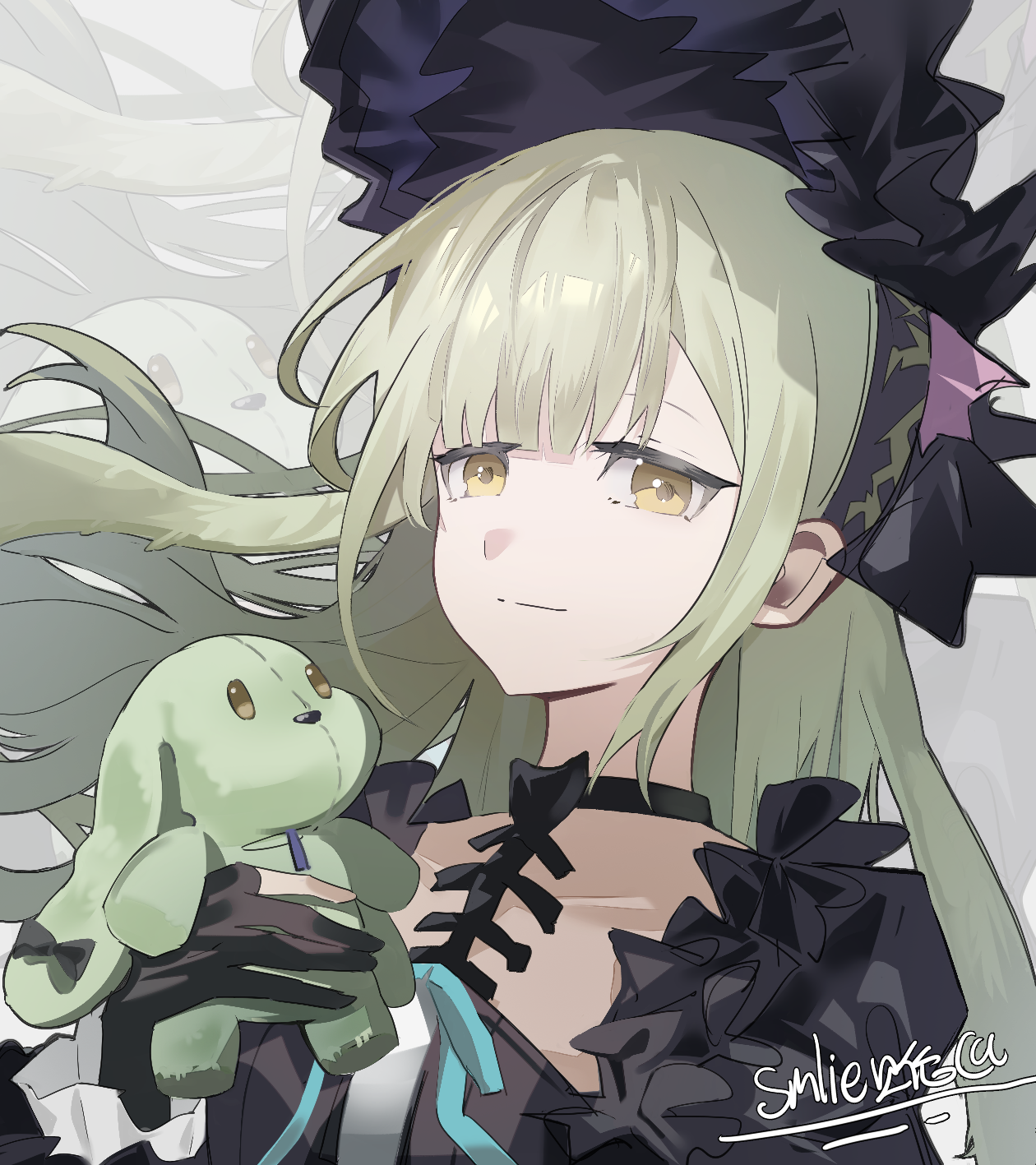 1girl animal_ears arknights bang_dream! bang_dream!_it's_mygo!!!!! black_bonnet black_gloves bonnet closed_mouth floppy_ears gloves gothic_lolita green_hair hair_ornament highres holding holding_stuffed_toy lolita_fashion long_hair looking_at_viewer rabbit_ears rabbit_girl sidelocks smile solo stuffed_animal stuffed_rabbit stuffed_toy upper_body wakaba_mutsumi wakaba_mutsumi_(marionette's_id) x_hair_ornament yellow_eyes yyz_bei_lun_sang