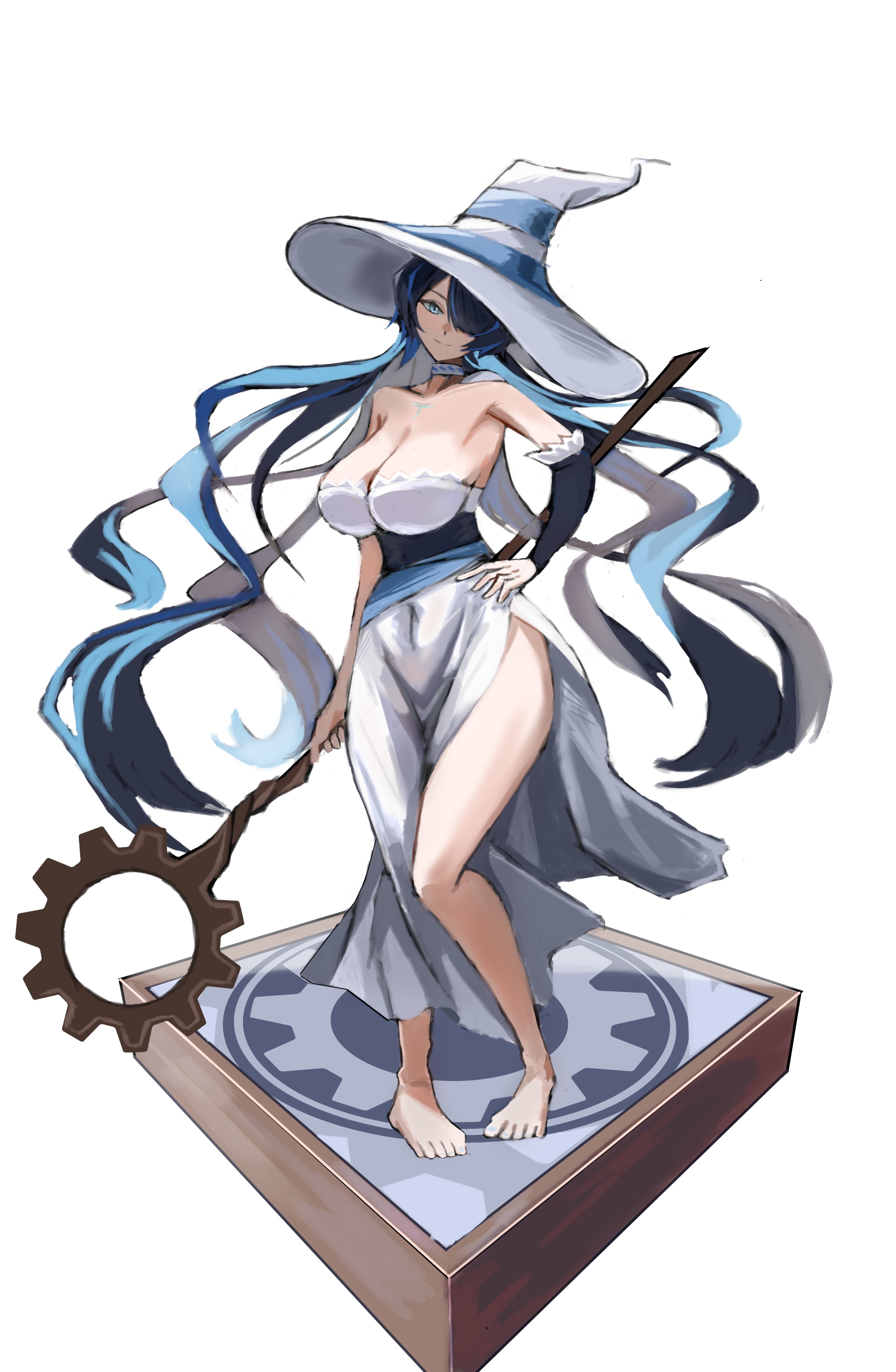 1girl absurdres black_hair blue_eyes blue_hair breasts cleavage dress erina_makina feet gogibahp hair_over_one_eye hat highres huge_breasts phase_connect staff tagme toes virtual_youtuber white_dress witch_hat