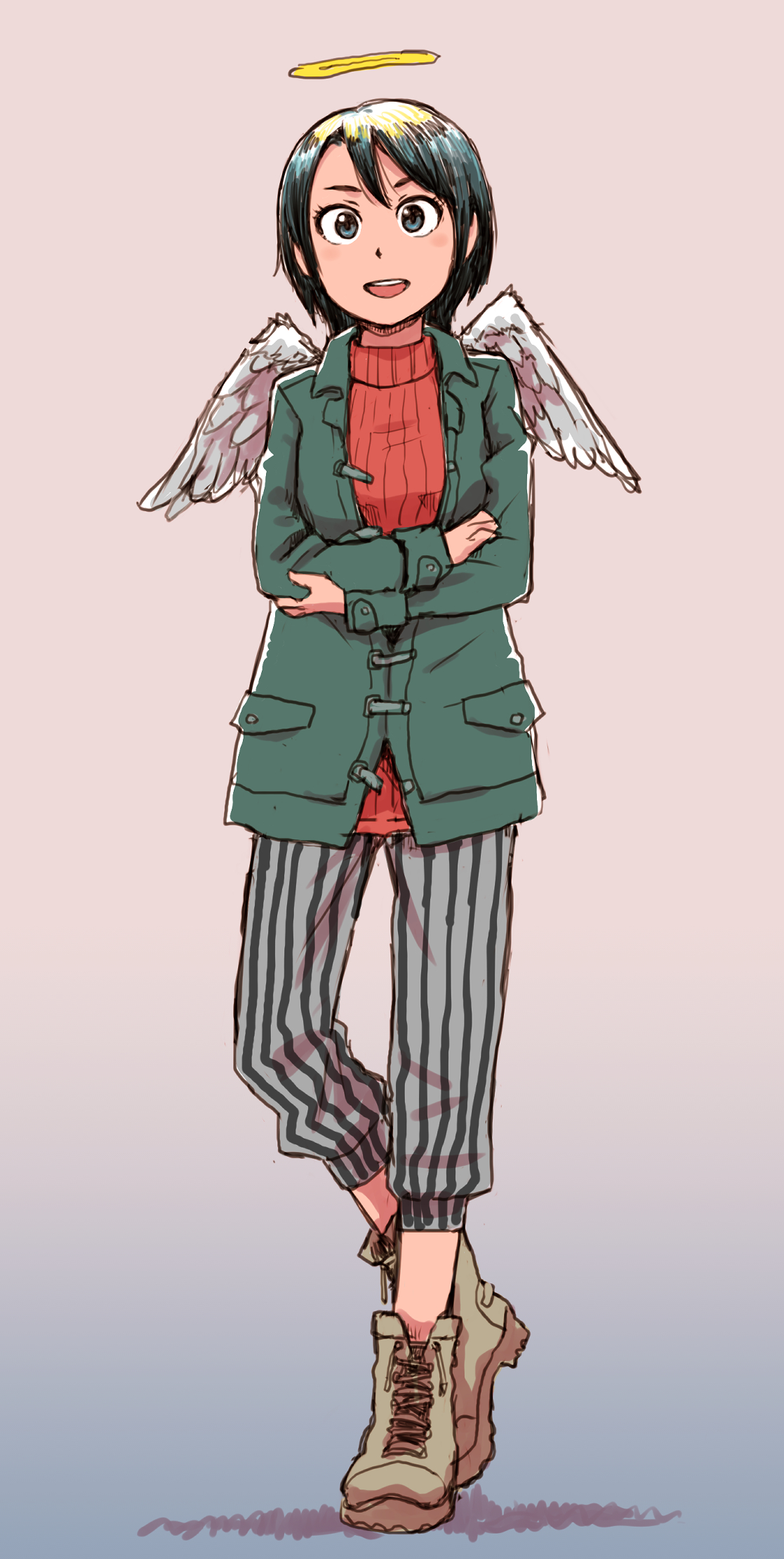 1girl :d black_hair brown_shoes coat commentary_request crossed_arms full_body gradient_background green_coat haibane_renmei halo highres kana_(haibane_renmei) naotan open_mouth pants red_sweater ribbed_sweater shoes short_hair smile standing striped_clothes striped_pants sweater white_wings wings