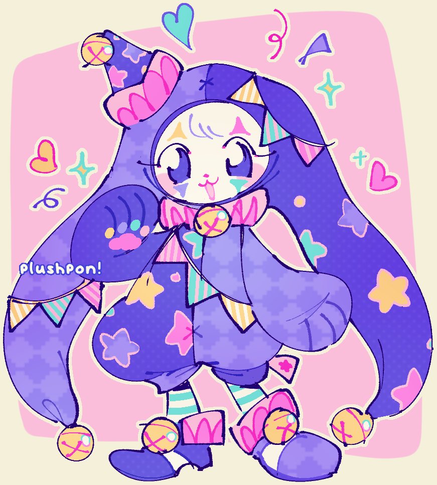 1other :3 bell border string_of_flags commentary english_commentary facepaint full_body furry hat jaltoid jester jester_cap jingle_bell looking_at_viewer neck_ruff onesie open_mouth original other_focus pink_background purple_eyes purple_shoes shoes smile solo sparkle standing star_(symbol) white_border white_fur yume_kawaii