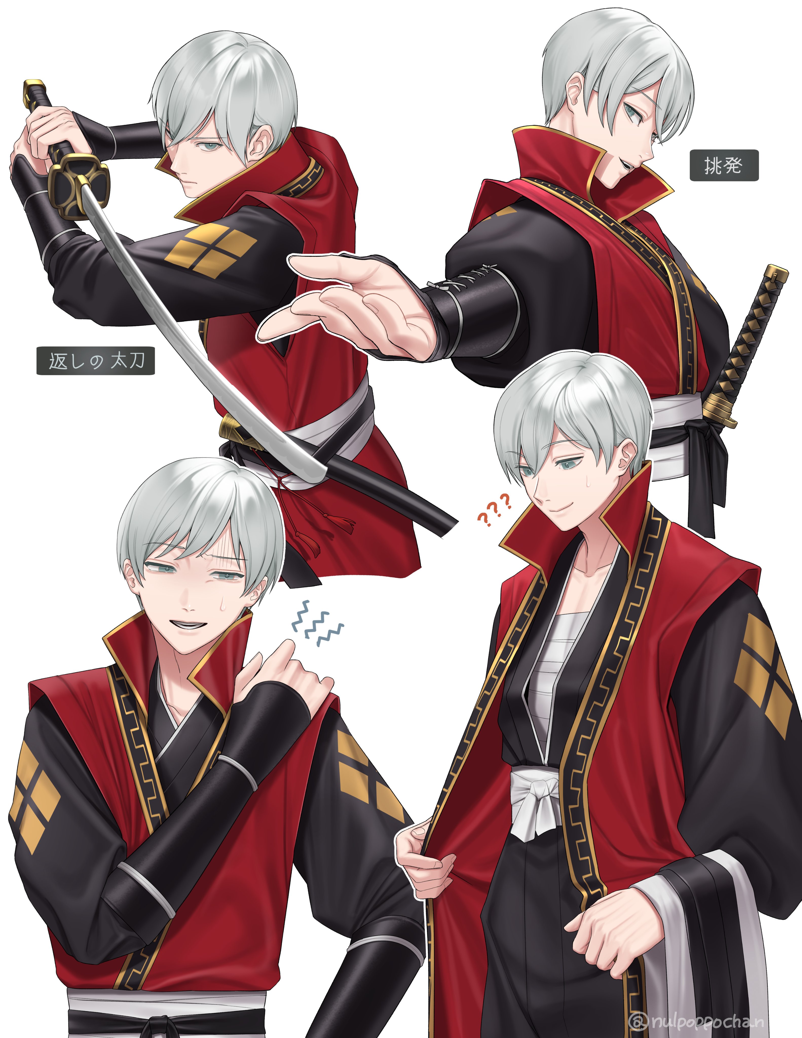 1boy ? ?? absurdres artist_name commentary_request cosplay grey_hair highres hikari_ku hikari_ku_(cosplay) holding holding_sword holding_weapon katana looking_at_viewer multiple_views nulpoppochan octopath_traveler octopath_traveler_ii simple_background smile standing sweatdrop sword temenos_mistral translation_request twitter_username weapon white_background