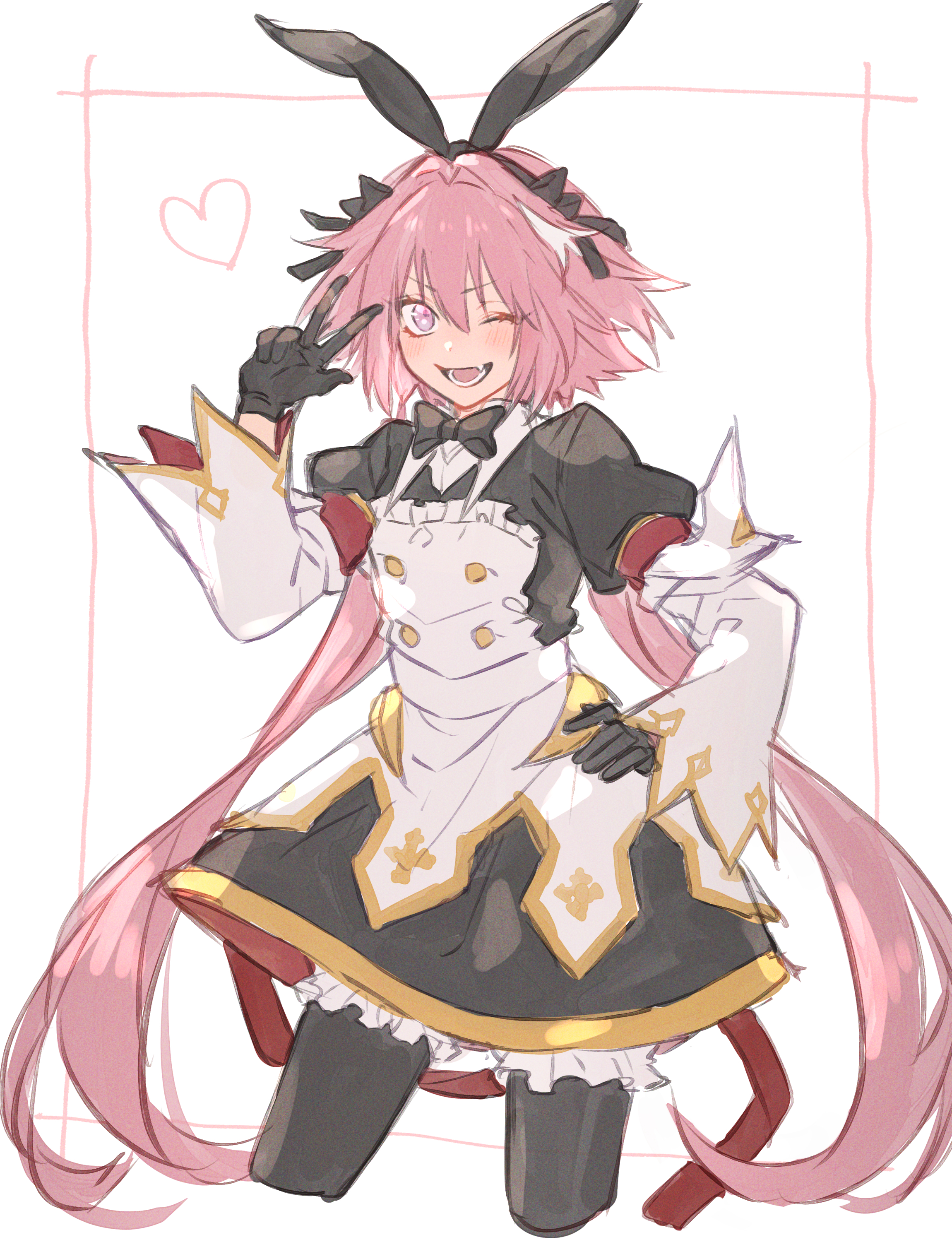 1boy absurdres astolfo_(fate) astolfo_(saber)_(fate) astolfo_(saber)_(third_ascension)_(fate) black_dress black_gloves black_hairband black_pantyhose commentary cowboy_shot dress fate/grand_order fate_(series) gloves hair_intakes hairband heart highres male_focus one_eye_closed open_mouth pantyhose pink_eyes pink_hair short_dress short_hair_with_long_locks sleeves_past_wrists smile solo tofu_(bean359) trap w