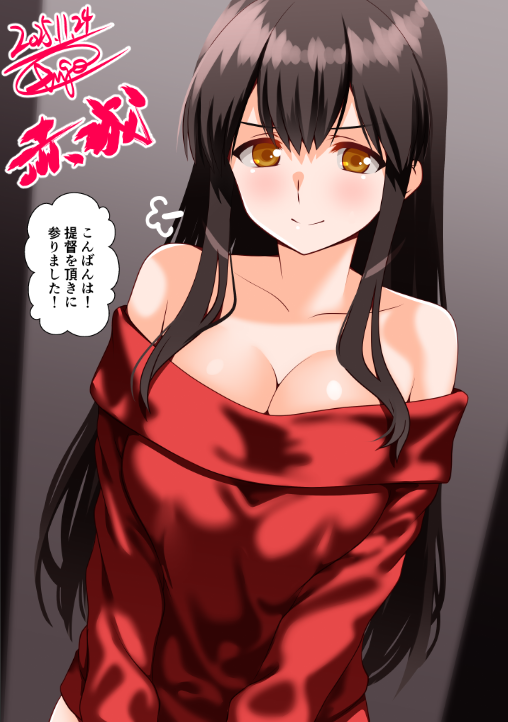 1girl akagi_(kancolle) black_hair breasts brown_eyes character_name cleavage commentary_request dated dutch_angle engo_(aquawatery) kantai_collection large_breasts looking_at_viewer off-shoulder_sweater off_shoulder one-hour_drawing_challenge puff_of_air red_sweater signature smile solo sweater upper_body