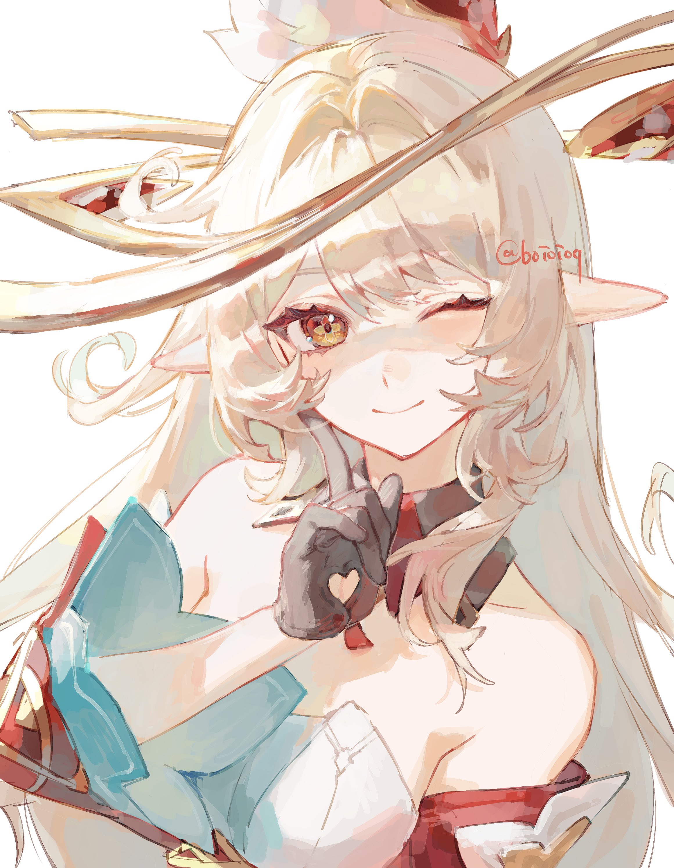 1girl absurdres alice_(genshin_impact) aqua_sleeves armpit_crease bare_shoulders black_collar black_gloves blonde_hair boioioq brown_eyes closed_mouth clothing_cutout collar commentary_request cowlick cross-shaped_pupils detached_collar detached_sleeves dress eyelashes feather_hair_ornament feathers finger_to_cheek gem genshin_impact glove_cutout gloves gold_halo hair_intakes hair_ornament hand_up heart_cutout highres index_finger_raised layered_sleeves leaning_to_the_side long_hair looking_at_viewer one_eye_closed pointy_ears portrait red_gem red_sleeves smile solo strapless strapless_dress swept_bangs symbol-shaped_pupils tsurime twitter_username white_background white_dress white_feathers yellow_pupils