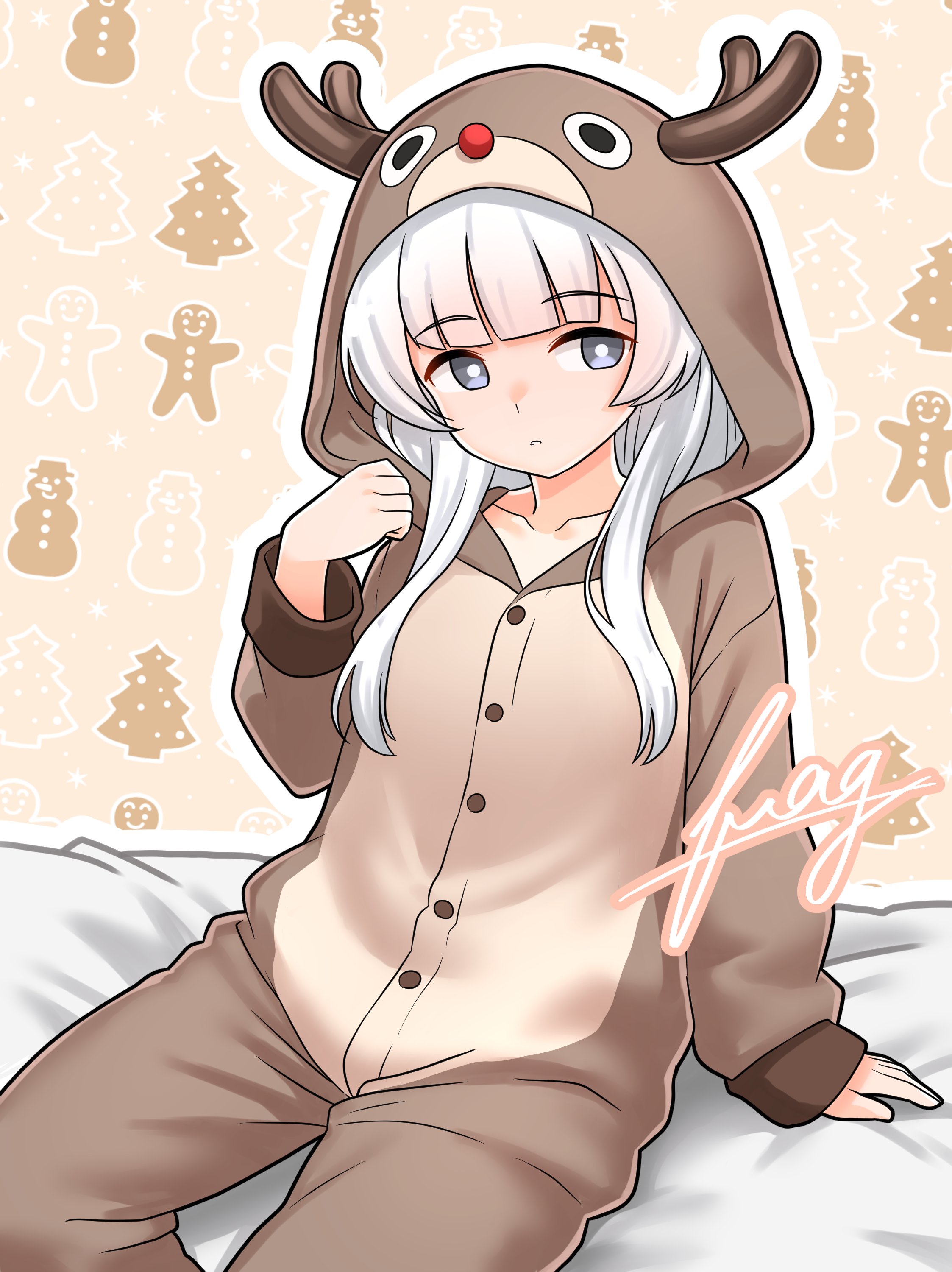 1girl absurdres animal_costume antlers bed_sheet buttons christmas christmas_tree collarbone commentary_request furaggu_(frag_0416) gingerbread_man grey_eyes highres horns kantai_collection reindeer_antlers reindeer_costume shirakumo_(kancolle) solo white_hair