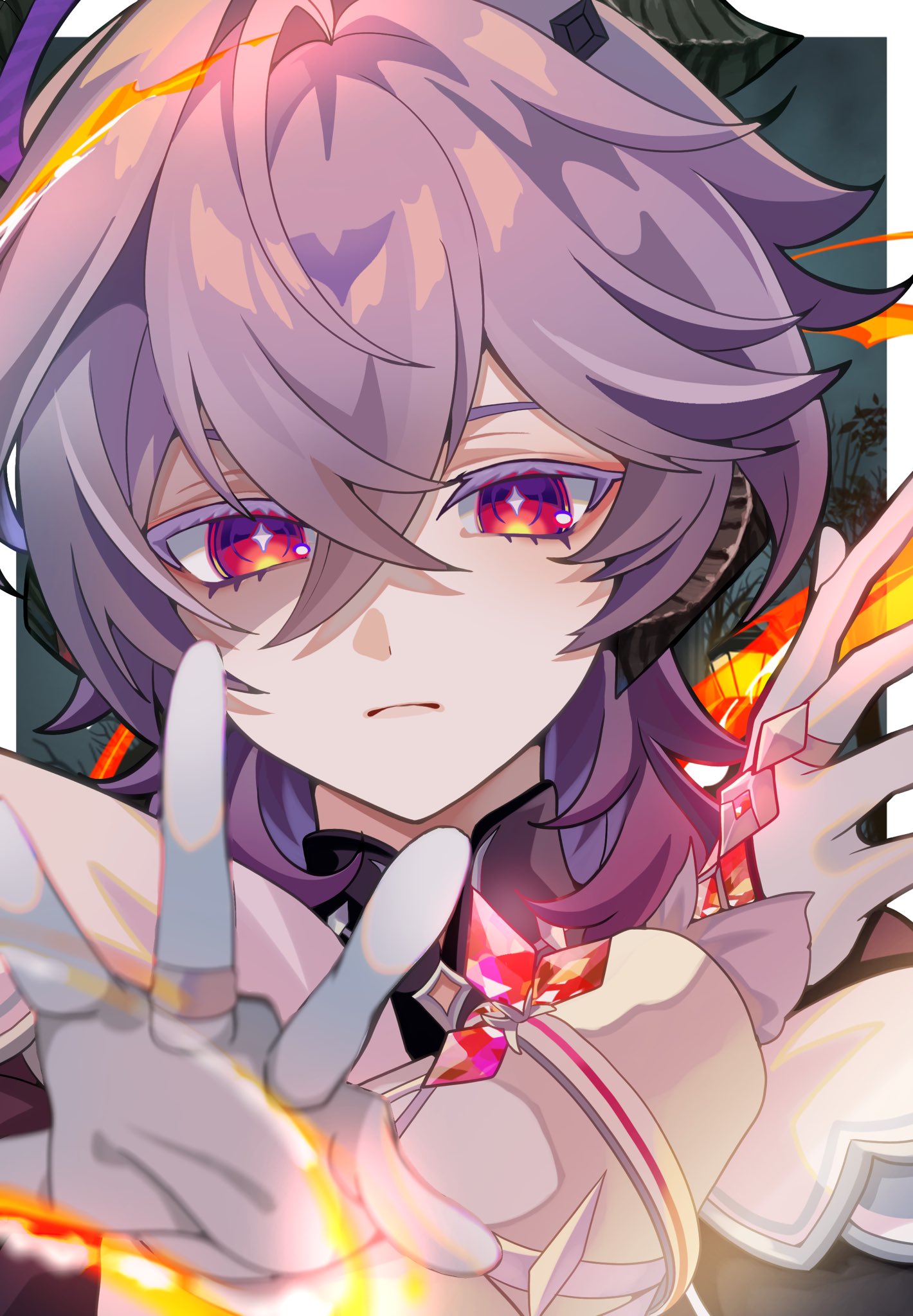 1boy black_horns border closed_mouth colored_eyelashes commentary crossed_bangs diamond-shaped_pupils diamond_(shape) gem genshin_impact gloves hair_between_eyes highres horns long_sleeves looking_at_viewer male_focus mandarin_collar medium_hair mini_durin_(genshin_impact) durin_(genshin_impact) outside_border purple_hair red_eyes red_gem rei_(sss35_ss3) solo symbol-shaped_pupils white_border white_gloves