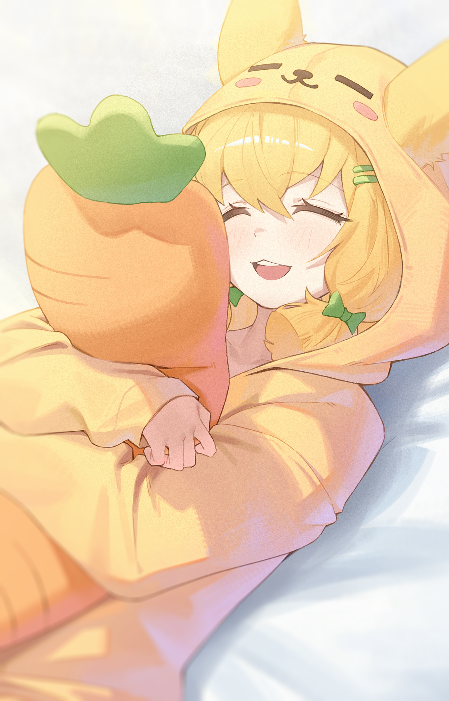 1girl :d absurdres alternate_costume animal_hood arknights blonde_hair bow carrot-shaped_pillow closed_eyes commentary_request daeyu_k facing_viewer green_bow hair_bow hair_ornament hairclip highres hood hood_up hugging_object kroos_(arknights) long_sleeves lying on_back on_bed open_mouth pillow pillow_hug rabbit_hood sleeves_past_wrists smile solo upper_body white_background