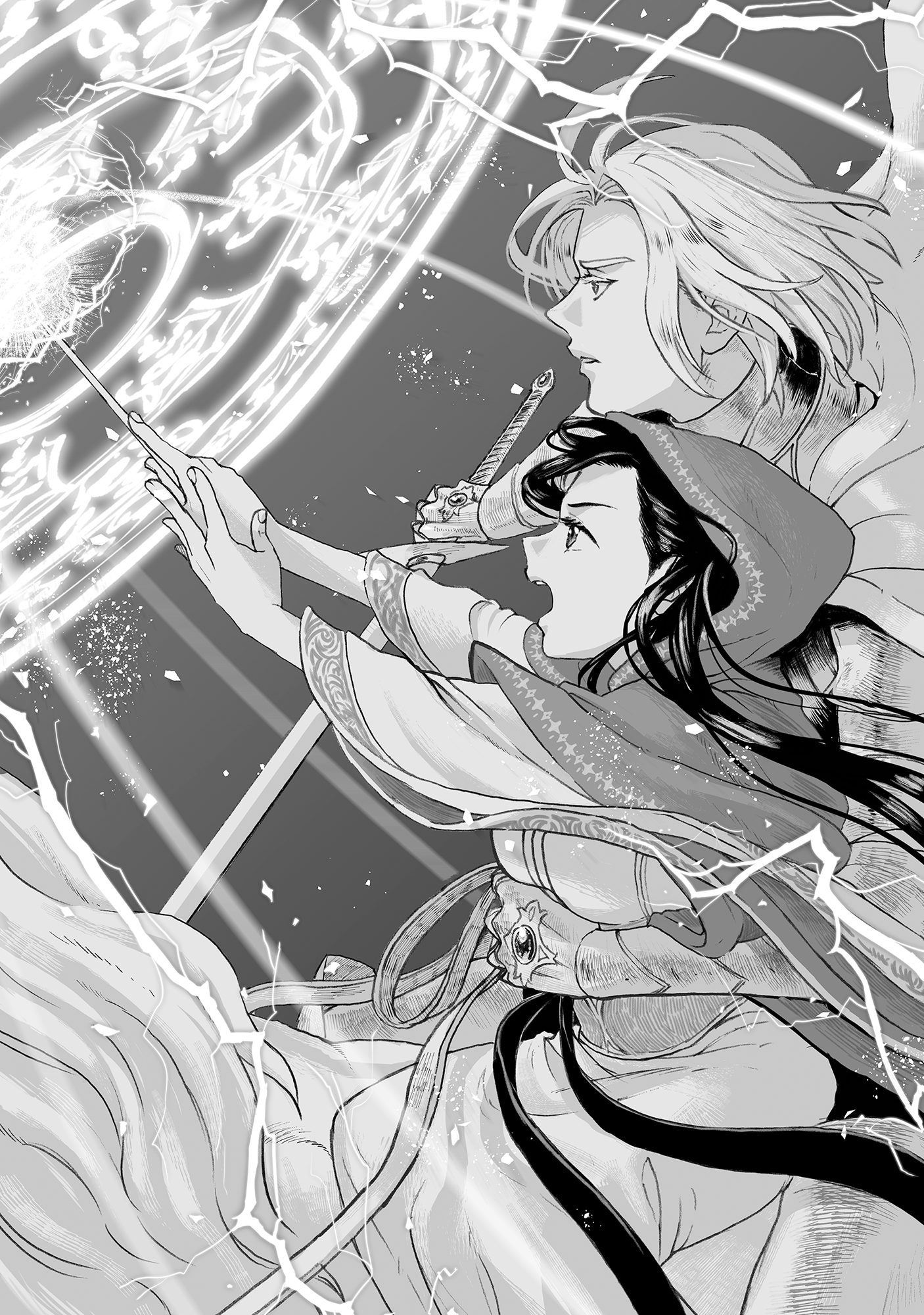 1boy 1girl arm_around_another's_waist breasts capelet commentary_request dress ferdinand_(honzuki_no_gekokujou) greyscale highres hitsuki_(hiidukii) holding holding_sword holding_wand holding_weapon honzuki_no_gekokujou hood hooded_capelet horse horseback_riding long_dress long_hair magic medium_breasts monochrome myne_(honzuki_no_gekokujou) open_mouth riding sword wand weapon
