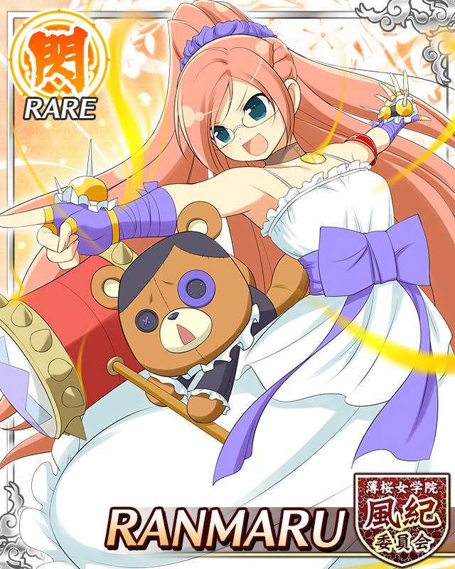 1girl :d armband blue_eyes border bow braid breasts button_eyes buttons card_(medium) character_name choker dress english_text fingerless_gloves game_cg glasses gloves hair_ornament hair_scrunchie half_up_half_down_braid high_ponytail holding holding_mallet kumapooh_(senran_kagura) large_bow long_hair looking_at_viewer mallet official_alternate_costume official_art open_mouth orange_hair outstretched_arms pointing ponytail purple_bow purple_gloves purple_scrunchie ranmaru_(senran_kagura) red_armband scrunchie senran_kagura senran_kagura_new_wave small_breasts smile solo stuffed_animal stuffed_toy swept_bangs teddy_bear very_long_hair white_dress
