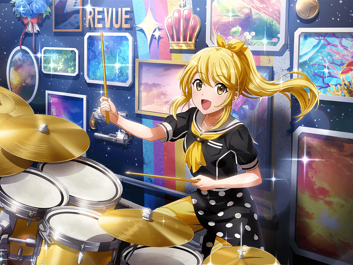 1girl badge bang_dream! bang_dream!_girls_band_party! blonde_hair bouquet cosplay crown_ornament drum drum_set drumsticks floating_hair flower game_cg gun handgun holding holding_drumsticks instrument long_hair looking_at_viewer neckerchief official_art otsuki_aruru open_mouth pants picture_frame plectrum polearm ponytail rapier revolver sailor_collar shoujo_kageki_revue_starlight shoujo_kageki_revue_starlight_-re_live- sidelocks sitting smile solo sparkle sword upper_body weapon white_sailor_collar yamabuki_saya yamabuki_saya_(cosplay) yellow_eyes yellow_neckerchief yellow_pants