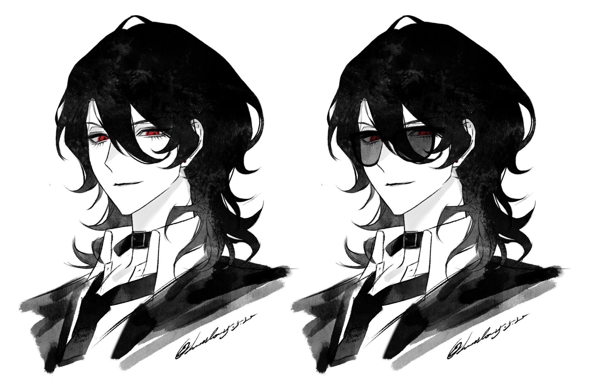 1boy belt_collar black_hair black_necktie black_shirt collar collared_shirt ensemble_stars! grey-tinted_eyewear hair_between_eyes highres looking_at_viewer lunaticotat male_focus medium_hair necktie portrait red_eyes sakuma_rei_(ensemble_stars!) shirt signature simple_background sunglasses tinted_eyewear variations wavy_hair white_background