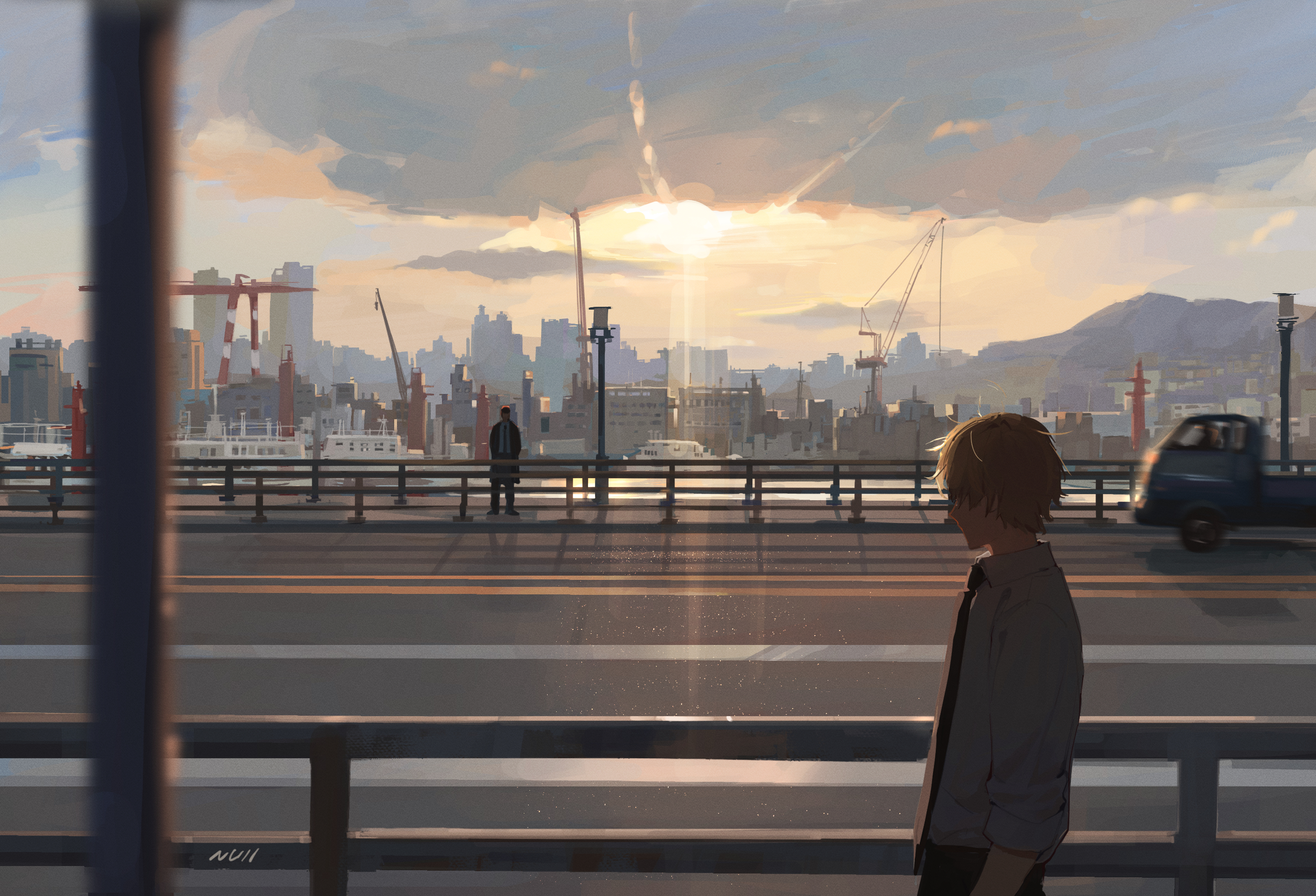1boy 1girl artist_name black_necktie blonde_hair building chainsaw_man city cityscape cloud collared_shirt commentary_request covered_eyes crane_(machine) denji_(chainsaw_man) faceless faceless_female highres kei_truck korean_commentary light_rays makima_(chainsaw_man) motion_blur motor_vehicle multi-lane_road necktie null_(skev7724) outdoors pickup_truck railing road scenery shirt short_hair signature sky standing street sunbeam sunlight truck white_shirt wide_shot