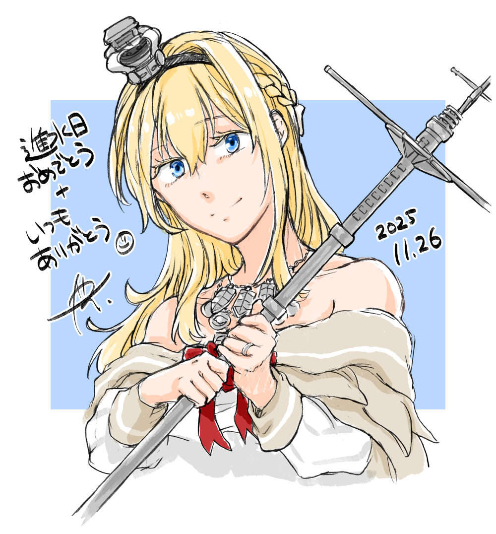 1girl black_hairband blonde_hair blue_eyes braid commentary crown dated dress hairband half_up_braid holding holding_scepter jewelry kantai_collection long_hair looking_at_viewer mini_crown necklace off-shoulder_dress off_shoulder scepter smile solo untranslatable_commentary translation_request warspite_(kancolle) white_dress yamada_rei_(rou)