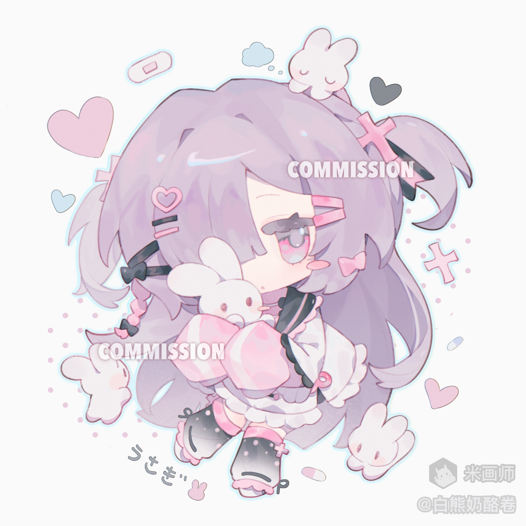 1girl animal bai_xiong_nailaojuan black_thighhighs blunt_bangs braid chibi chibi_only full_body hair_ornament hair_over_one_eye hairclip heart heart_hair_ornament highres holding holding_animal jacket long_hair long_sleeves looking_at_viewer mihuashi_username original parallel_hairclips parted_lips pink_jacket purple_eyes purple_hair rabbit shoes single_braid sleeves_past_fingers sleeves_past_wrists solo standing thighhighs track_jacket two_side_up white_shoes