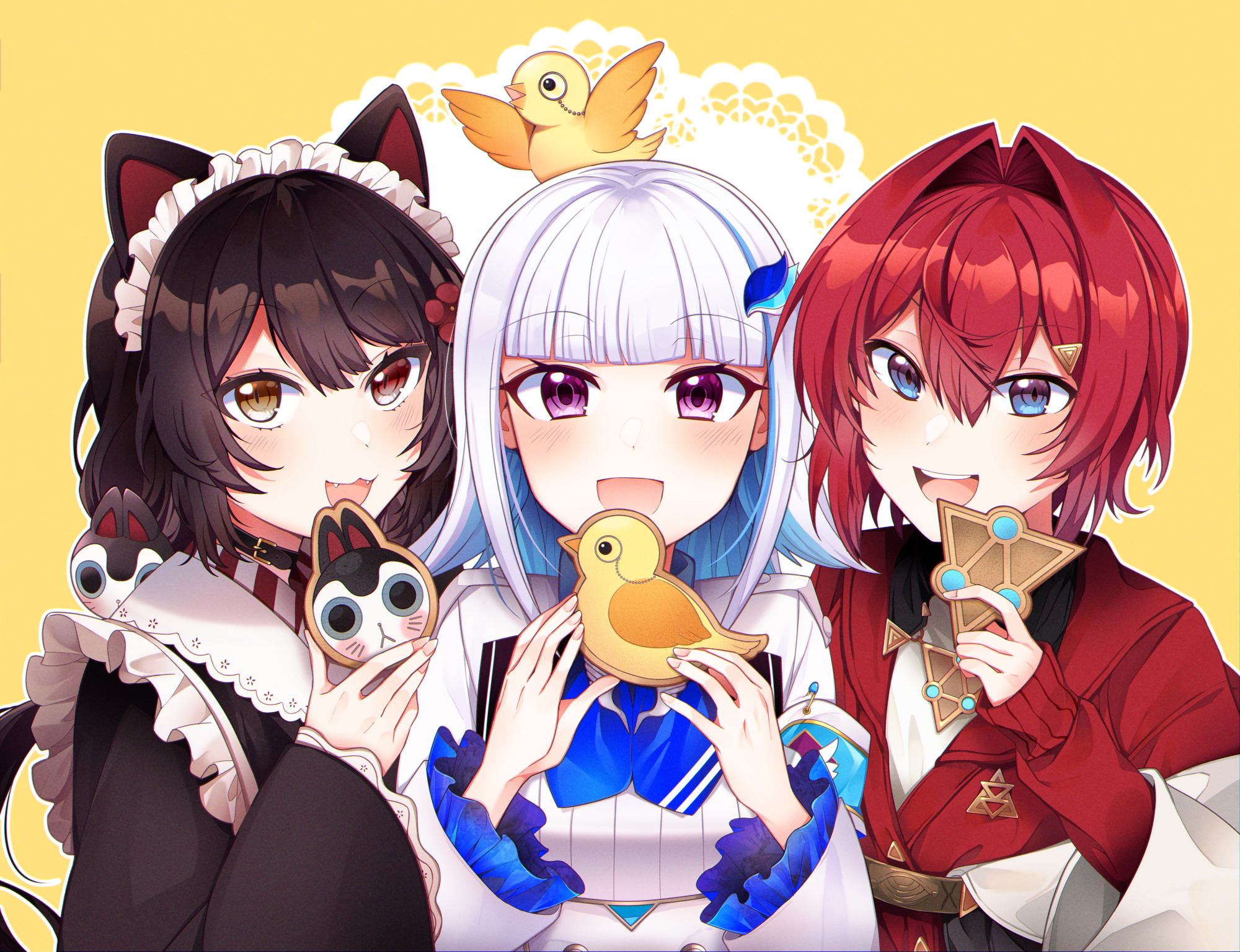 3girls :3 :d ange_katrina ange_katrina_(1st_costume) animal animal_ears animal_hair_ornament animal_on_head bird bird_on_head black_collar blue_eyes blue_hair blue_neckerchief blunt_bangs blush brown_hair brown_kimono cardigan collar colored_inner_hair commentary_request dog_ears dog_girl double-parted_bangs fangs flower frilled_sleeves frills gradient_eyes group_picture hair_between_eyes hair_flower hair_intakes hair_ornament hand_up heterochromia highres holding inui_toko inui_toko_(1st_costume) japanese_clothes kimono lize_helesta lize_helesta_(1st_costume) long_bangs long_hair long_sleeves looking_at_viewer maid_headdress mitsumine_(ookami_no_oyashiro) monocle multicolored_eyes multicolored_hair multiple_girls neckerchief nijisanji on_head open_mouth outline purple_eyes red_cardigan red_eyes red_hair redrawn sanbaka_(nijisanji) sebastian_piyodore short_hair shrug_(clothing) sidelocks sleeves_past_wrists slit_pupils smile streaked_hair teeth textless_version triangle_hair_ornament two-tone_hair upper_body upper_teeth_only variant_set virtual_youtuber white_hair white_headdress white_outline white_shrug yellow_background yellow_bird yellow_eyes