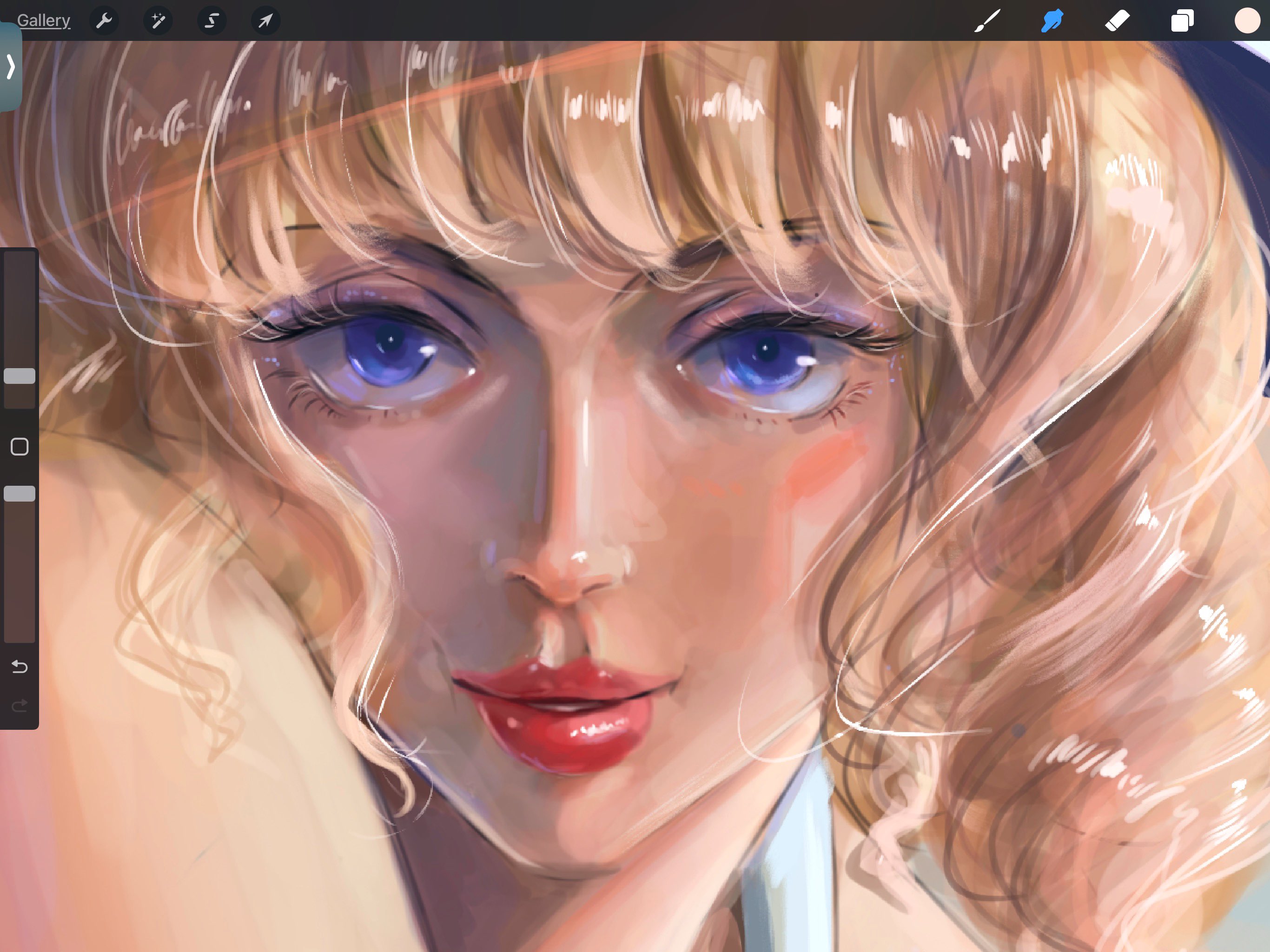1girl art_program_in_frame blonde_hair blue_eyes blunt_bangs close-up drill_hair eyelashes eyeshadow highres light_smile looking_at_viewer makeup mixed-language_commentary one_piece parted_lips stupidtako stussy_(one_piece)