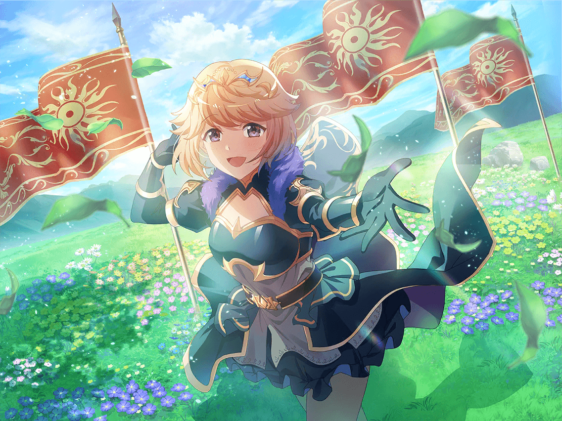 1girl black_dress black_gloves brown_eyes brown_hair dress field flag flower flower_field fur-trimmed_dress fur_trim game_cg gloves headpiece kobato_ryoko looking_at_viewer official_art open_mouth reaching reaching_towards_viewer short_hair shoujo_kageki_revue_starlight shoujo_kageki_revue_starlight_-re_live- solo standing