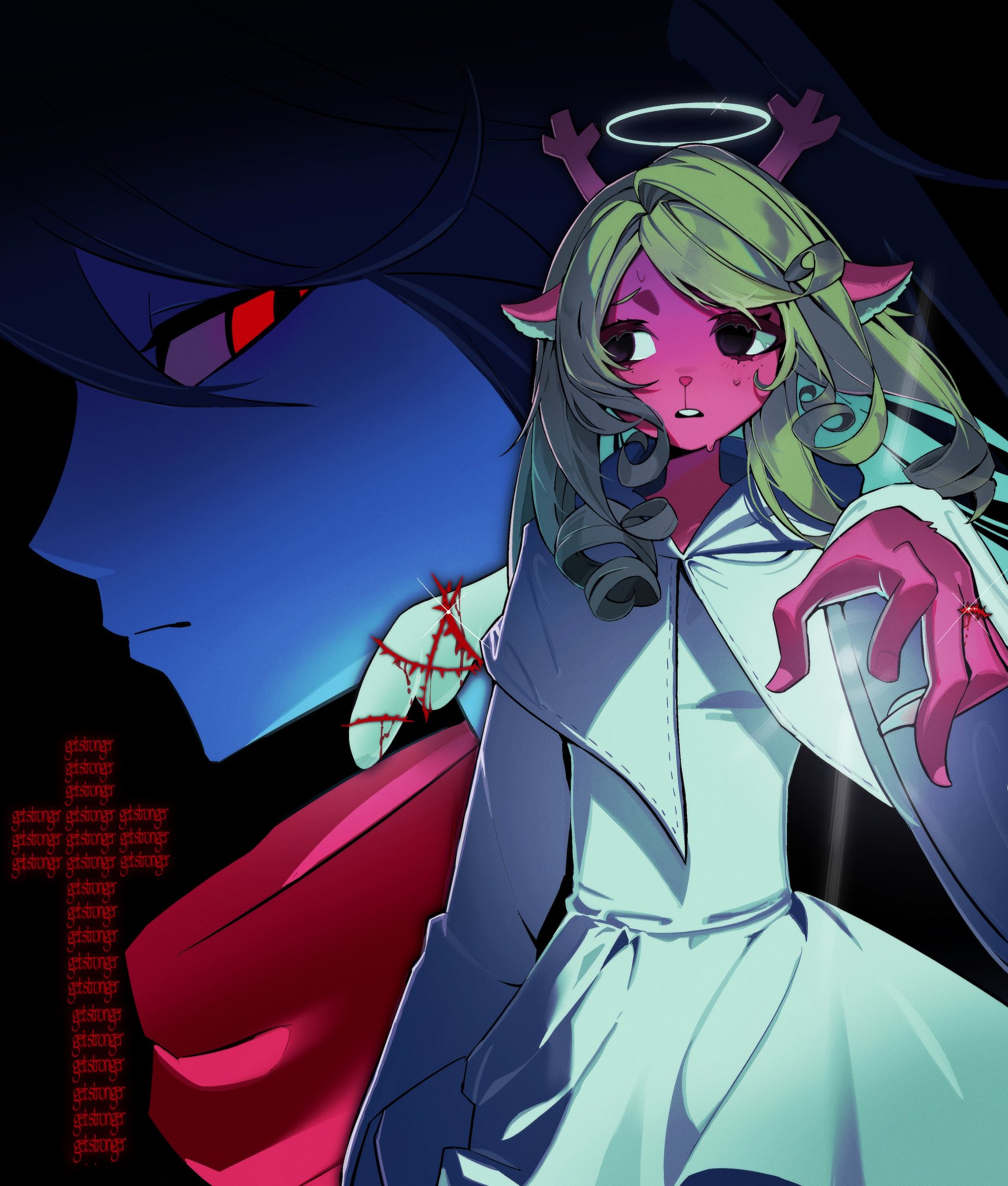 0ni91ri 1girl 1other animal_ears antlers black_eyes blonde_hair blue_hair blue_skin capelet colored_skin commentary cross deer_antlers deer_ears deer_girl deltarune english_text furry furry_female halo hashtag-only_commentary highres hood hooded_capelet horns jewelry kris_(dark_world)_(deltarune) kris_(deltarune) long_hair looking_to_the_side noelle_holiday noelle_holiday_(dark_world) red_eyes ring robe sweat thorn_ring_(deltarune) thorns utdr_(toby_fox) weird_route_(deltarune) white_capelet white_robe white_wings wings