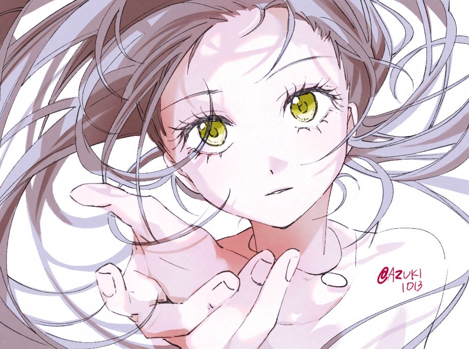 azuki_1013 black_hair commentary_request jewelry kamisaki_hikaru long_hair medalist_(manga) necklace reaching reaching_towards_viewer signature upper_body white_background yellow_eyes