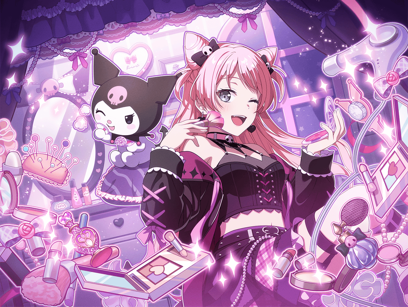 1girl ;d bang_dream! bang_dream!_it's_mygo!!!!! bare_shoulders black_jacket blush breasts chihaya_anon cone_hair_bun earrings fang hair_bun heart heart_earrings jacket jewelry kuromi long_hair long_sleeves looking_at_viewer makeup makeup_brush medium_breasts midriff my_melody_(series) navel official_art one_eye_closed open_mouth pincushion pink_hair sanrio smile solo teeth thigh_strap third-party_source upper_teeth_only