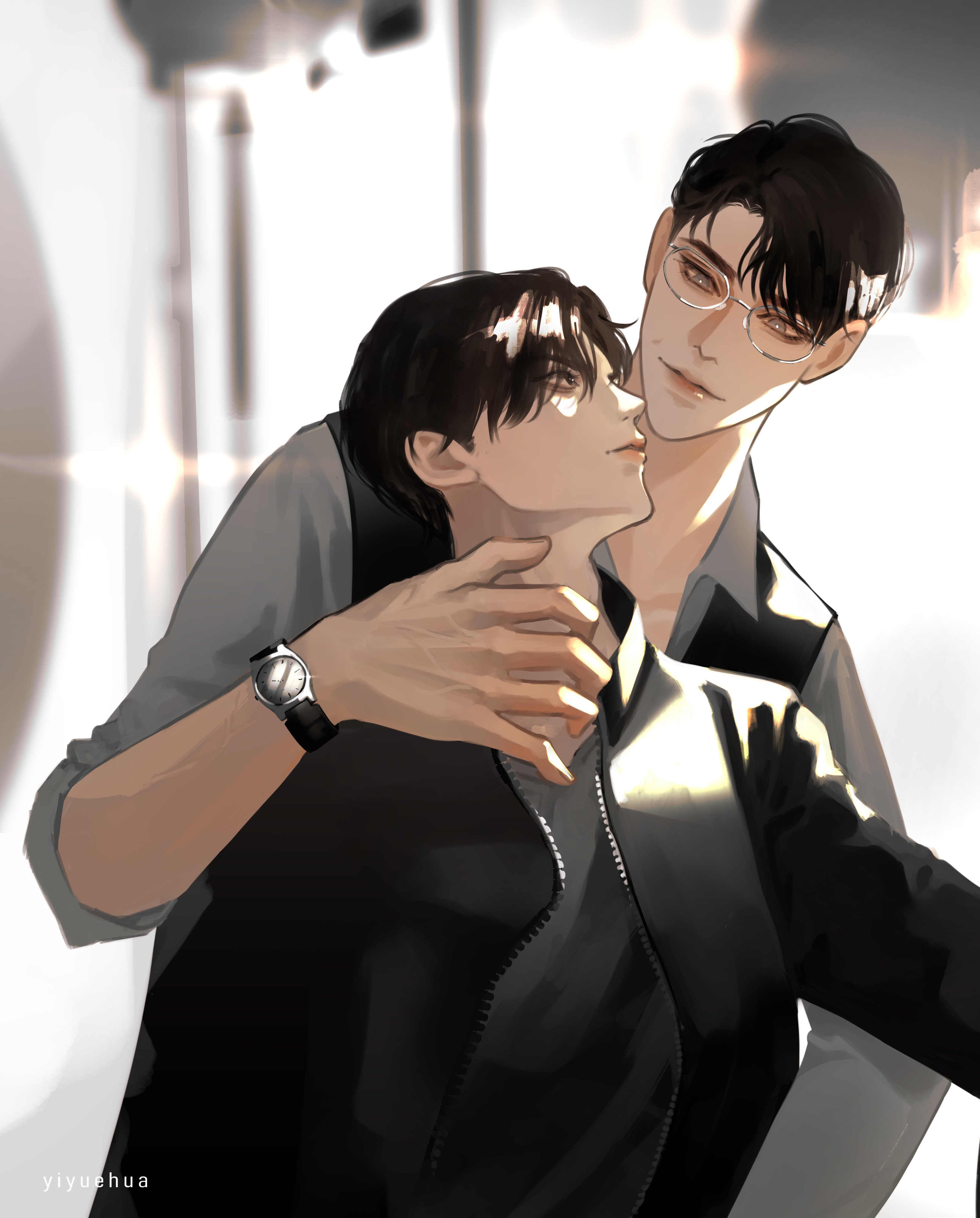 2boys absurdres alternate_costume black_hair black_jacket black_shirt black_vest blue_eyes character_request collared_shirt glasses hand_on_another's_neck head_tilt highres jacket large_hands looking_at_another male_focus multiple_boys payback shirt short_hair sidelighting smile vest watch white_shirt wristwatch yiyuehua