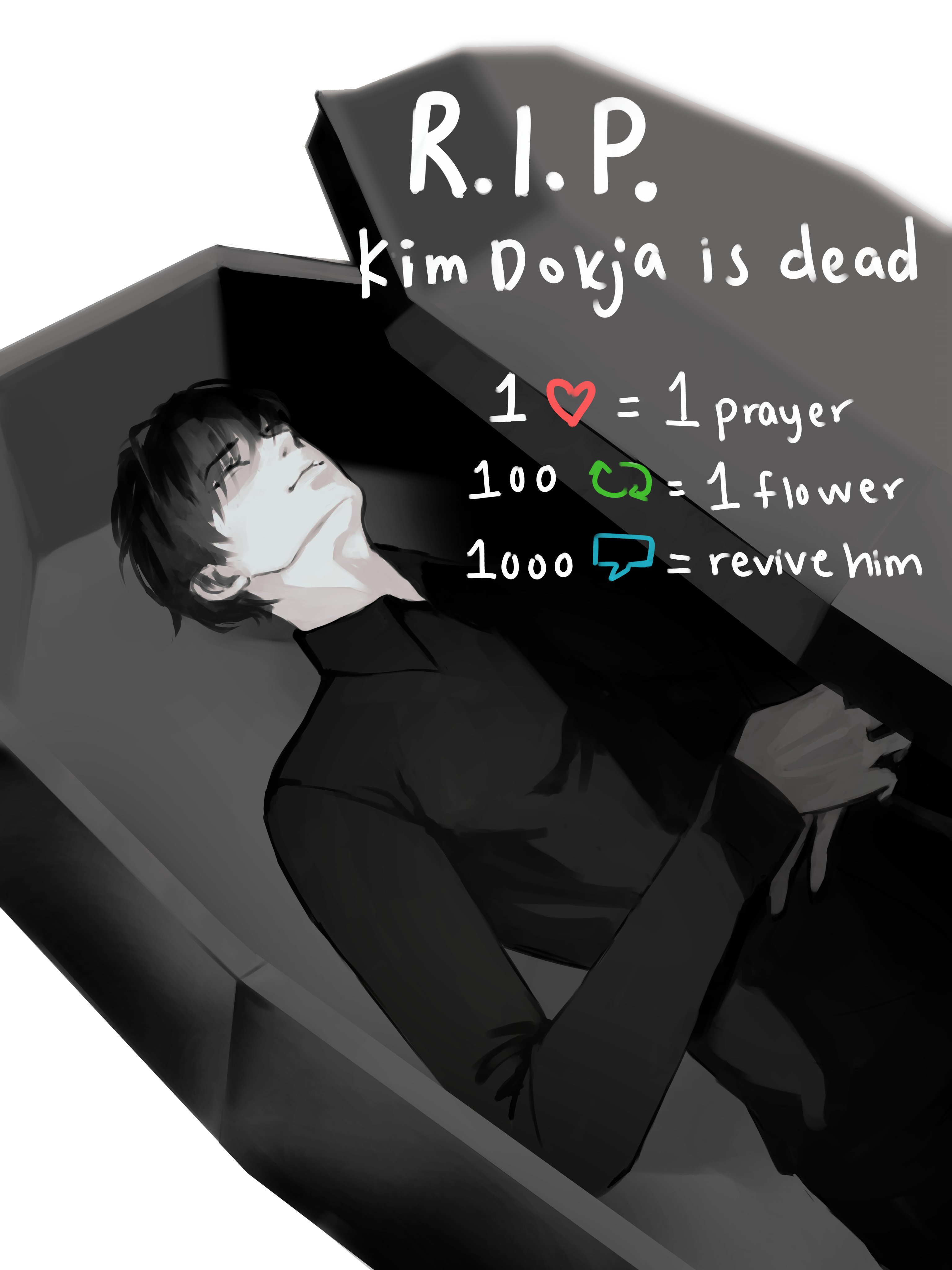 1boy absurdres black_hair black_shirt coffin collared_shirt english_text hands_on_own_stomach highres kim_dokja like_and_retweet lying male_focus omniscient_reader's_viewpoint on_back shirt short_hair solo upper_body yiyuehua