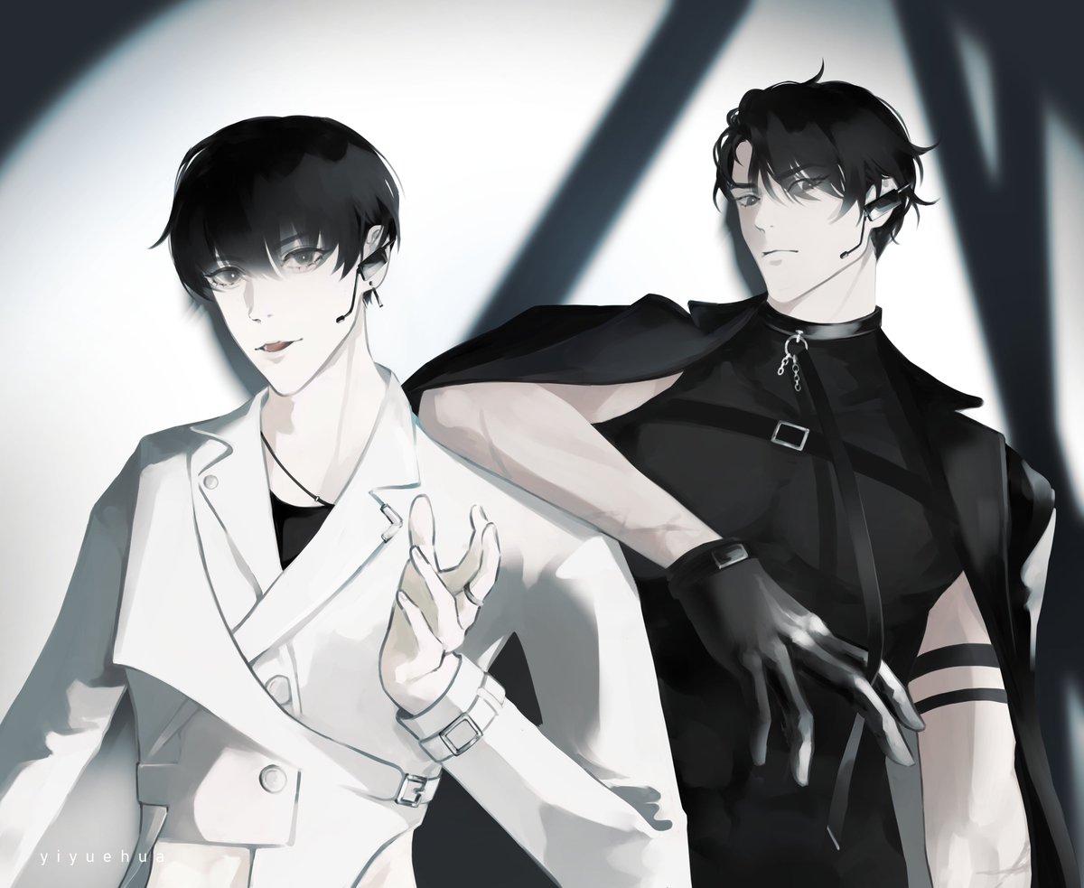2boys black_coat black_eyes black_gloves black_hair black_shirt coat collar cowboy_shot elbow_on_another's_shoulder elbow_rest gloves head_tilt headset holding_own_leash jewelry kim_dokja leash looking_at_viewer male_focus multiple_boys omniscient_reader's_viewpoint ring shirt short_hair white_coat yiyuehua yoo_joonghyuk