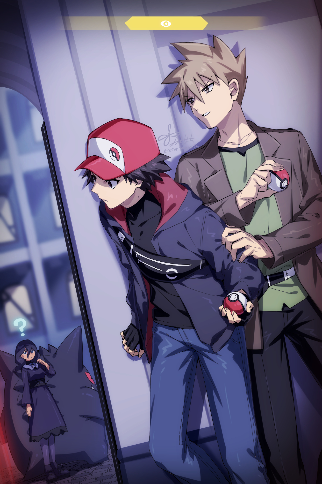 1girl 2boys 88_(einnimnech) ? bag baseball_cap black_dress black_gloves black_hair black_jacket black_pants black_pantyhose black_shirt blue_oak blue_pants breasts brown_eyes brown_hair brown_jacket colored_sclera dress fingerless_gloves gen_1_pokemon gengar ghost gloves green_shirt hair_between_eyes hat hex_maniac_(pokemon) hex_maniac_(pokemon_legends:_z-a) highres holding jacket long_hair long_sleeves multiple_boys neck_ribbon nintendo outdoors pants pantyhose poke_ball poke_ball_(basic) pokemon pokemon_(creature) pokemon_legends:_z-a pokemon_red/green/blue/yellow purple_ribbon red_(pokemon) red_hat red_sclera ribbon shirt short_hair shoulder_bag spiked_hair