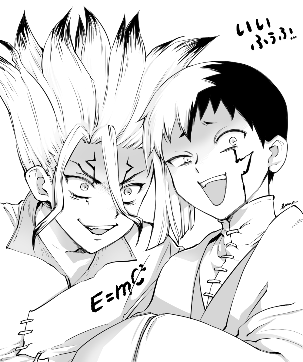 2boys asagiri_gen dr._stone e=mc2_(equation) ebioisii05 evil_smile facial_mark greyscale ishigami_senkuu laughing male_focus monochrome multicolored_hair multiple_boys open_mouth short_hair simple_background smile spiked_hair split-color_hair two-tone_hair upper_body white_background