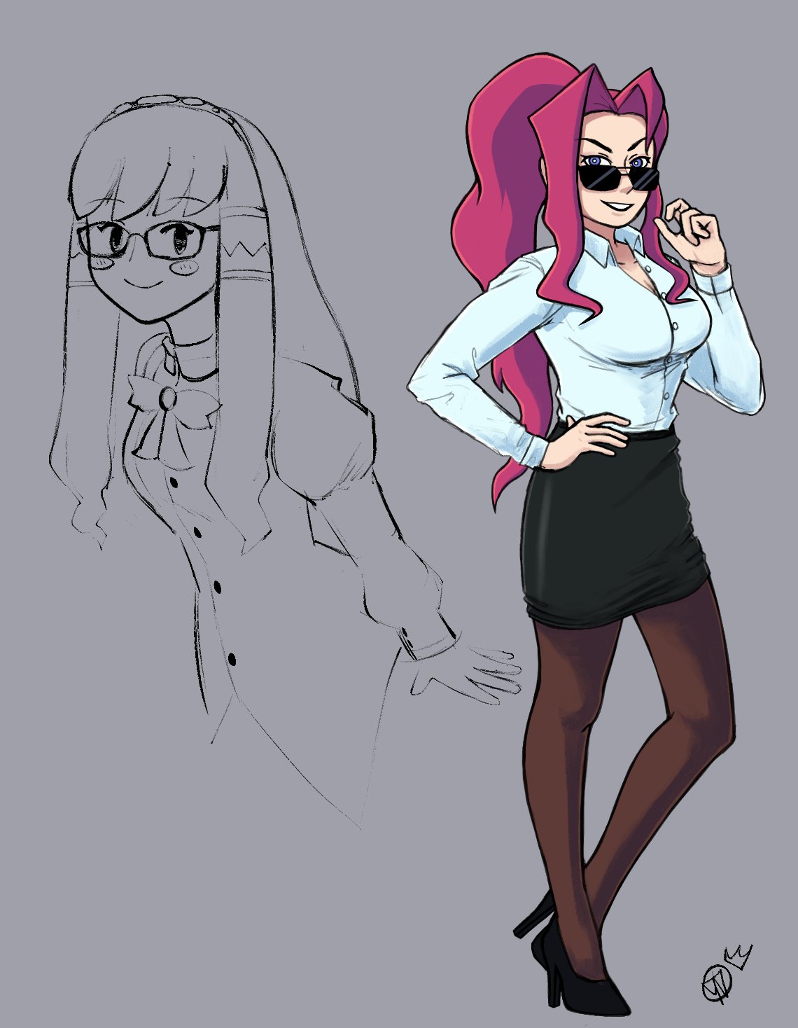 2025 2girls arms_at_sides artist_logo black_lips black_shoes blush_stickers bow bowtie breasts brown_pantyhose cleavage collared_shirt commentary cropped_torso curtained_hair english_commentary female_focus full_body glasses grey_background grin hairband hairdressing hand_on_own_hip hand_up high_heels highres jellycrowned kagoshima_botan large_breasts logo long_hair long_sleeves looking_at_viewer medium_breasts multiple_girls pantyhose pencil_skirt pink_hair puffy_long_sleeves puffy_sleeves pumps purple_eyes shirt shoes sidelocks simple_background skirt sleeve_cuffs smile smug standing straight_hair sunglasses sushi_ben tsujigiri_minami very_long_hair vest white_shirt