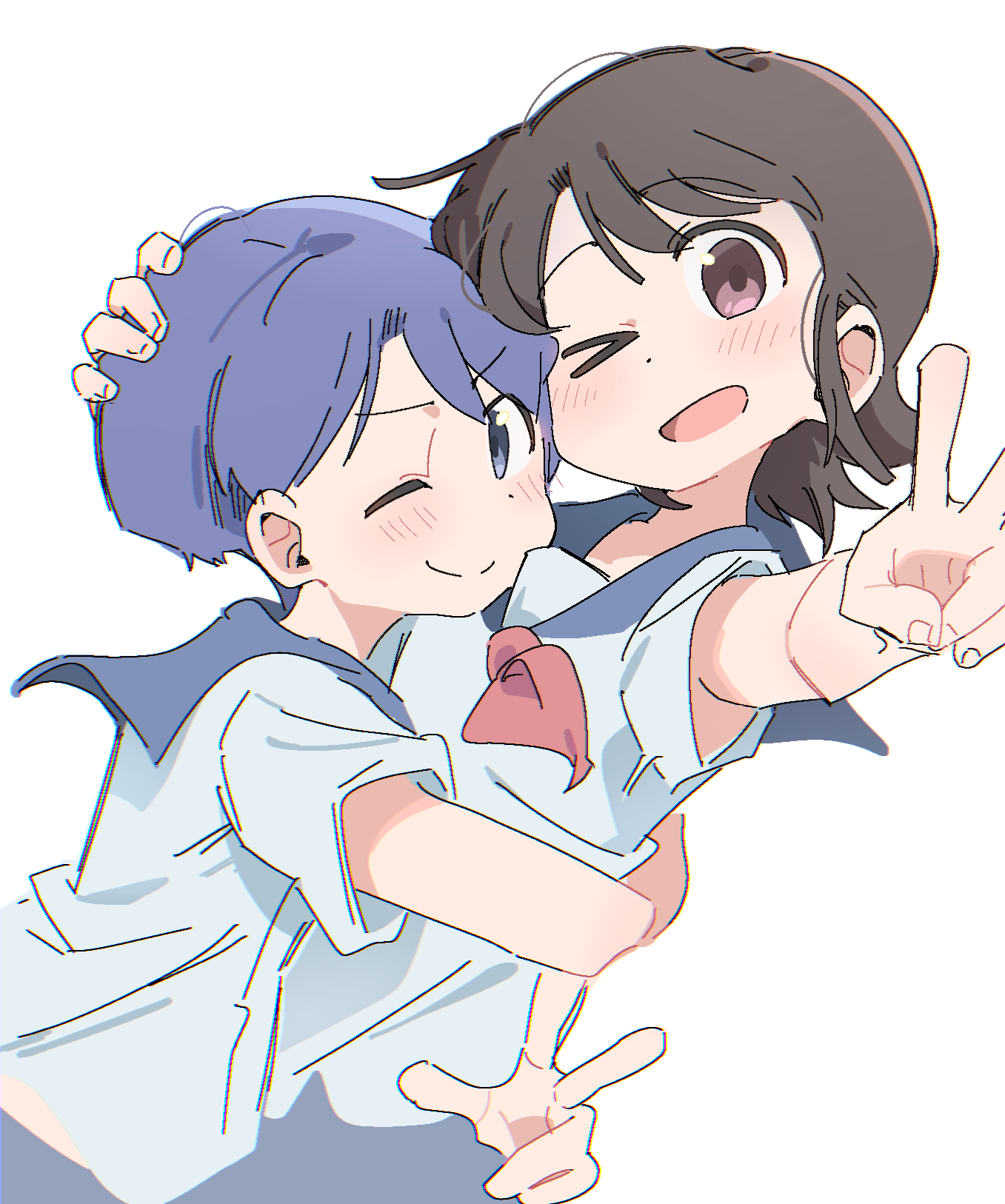 >_o 2girls amakazari_eri black_hair blue_eyes blue_hair blue_sailor_collar blue_skirt blush city_(arawi_keiichi) closed_mouth commentary dot_nose hand_on_another's_head hand_on_another's_waist highres hug looking_at_viewer makabe_matsuri multiple_girls neckerchief one_eye_closed open_mouth pink_eyes red_neckerchief sailor_collar school_uniform serafuku short_hair simple_background skirt smile v very_short_hair white_background white_serafuku wichimi