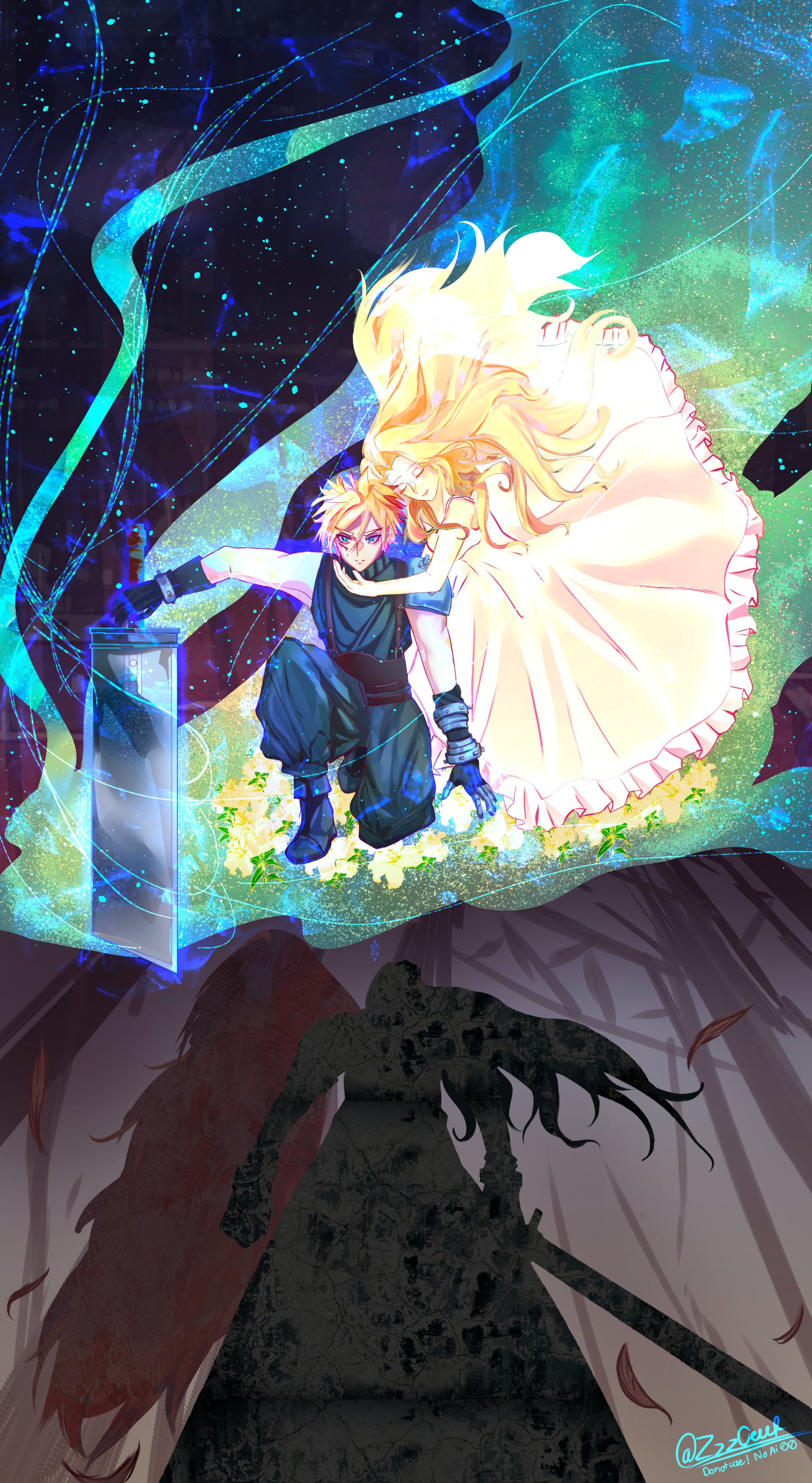 absurdres aerith_gainsborough arm_around_neck armor baggy_pants black_gloves black_pants black_shirt blonde_hair blue_eyes brown_hair buster_sword closed_eyes cloud_strife dress falling_feathers feathers final_fantasy final_fantasy_vii flower gloves hair_between_eyes highres holding holding_sword holding_weapon lifestream lily_(flower) long_dress long_hair on_one_knee pants parted_bangs pauldrons pink_dress sephiroth shadow shirt short_hair shoulder_armor sidelocks single_pauldron sword weapon yellow_flower zzzoeuf