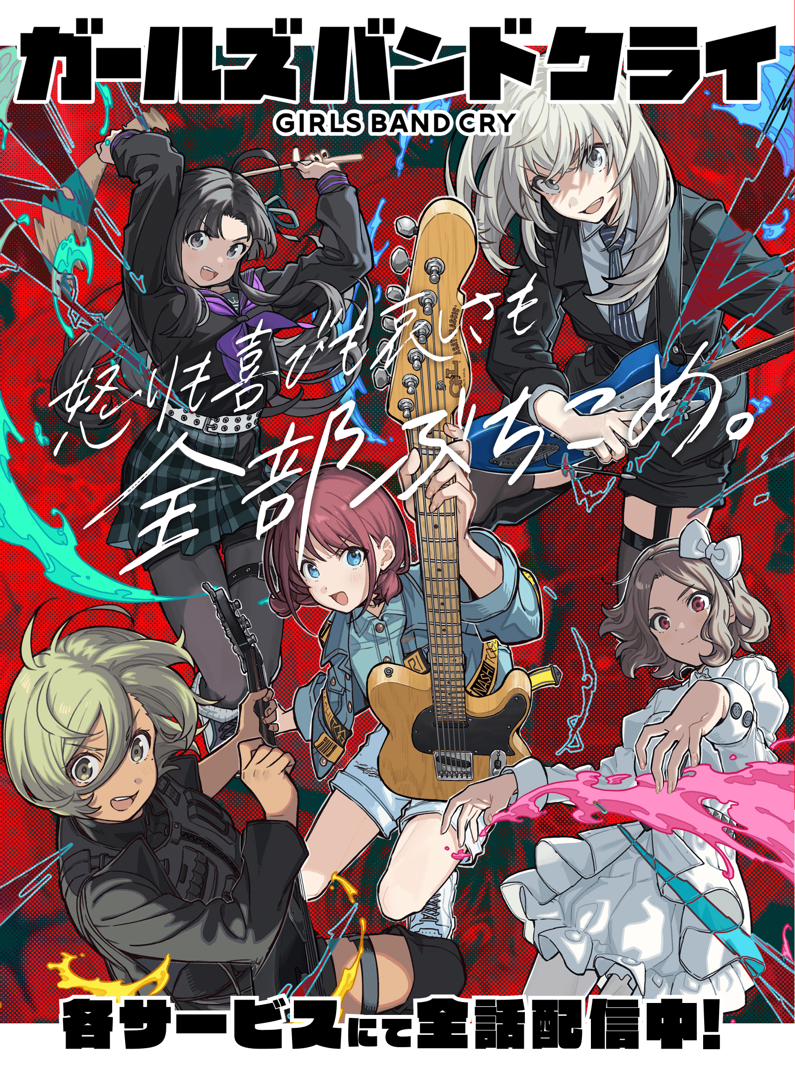 5girls :d arms_up awa_subaru bass_guitar bird black_hair black_jacket black_pantyhose black_shirt black_shorts black_thighhighs blazer blue_eyes blue_jacket blue_necktie bow brown_hair closed_mouth collared_dress collared_shirt copyright_name dove dress dress_shirt drumsticks ebizuka_tomo electric_guitar fender_telecaster garter_straps girls_band_cry green_eyes green_hair grey_eyes grey_hair grey_skirt guitar hair_between_eyes hair_bow highres holding holding_bass_guitar holding_drumsticks holding_guitar holding_instrument instrument iseri_nina jacket kawaragi_momoka key_visual long_hair long_hair_between_eyes long_sleeves looking_at_viewer low_twintails medium_hair miniskirt multiple_girls music necktie official_art open_clothes open_jacket open_mouth pantyhose parted_bangs plaid_clothes plaid_skirt playing_guitar playing_instrument pleated_skirt promotional_art red_background red_eyes rupa_(girls_band_cry) school_uniform serafuku shirt short_twintails shorts shorts_under_skirt skirt smile striped_clothes striped_necktie teeth teshima_nari thighhighs togenashi_togeari twintails upper_teeth_only v-shaped_eyebrows white_bow white_pantyhose white_shirt white_shorts