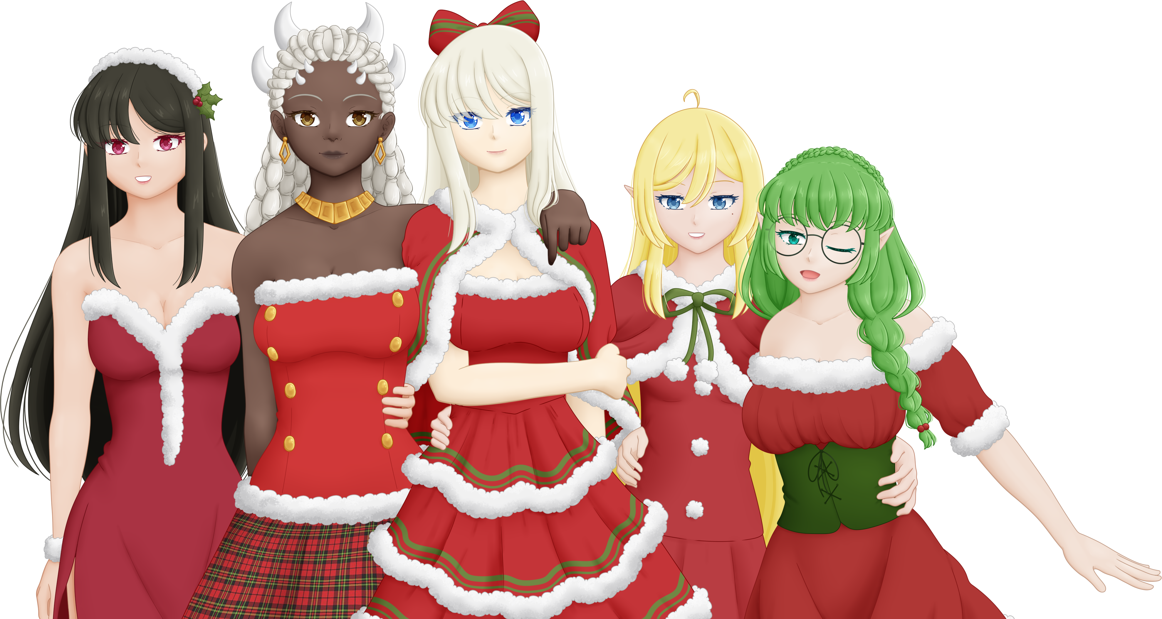 5girls absurdres ahoge arm_around_another's_waist arm_around_shoulder bare_shoulders black_hair blonde_hair blue_eyes bow braid breasts brown_eyes capelet christmas christmas_outfit cleavage closed_mouth commission commissioner_upload corset dark-skinned_female dark_skin dress earrings elf euphemy_sylvaine everyone flat_chest fur-trimmed_capelet fur-trimmed_dress fur_trim glasses green_eyes green_hair hair_bow hair_ornament hand_on_another's_hip hand_on_another's_shoulder hand_on_another's_waist highres hong_mei_ling_(ways_of_darkness) horns jewelry large_breasts long_hair looking_at_viewer lotte_farona medium_breasts multiple_girls nemezish official_art one_eye_closed open_mouth plaid_clothes plaid_skirt pointy_ears queen_imani red_capelet red_dress red_eyes santa_costume santa_dress selinanovalight simple_background skirt smile strapless strapless_dress transparent_background twin_braids very_dark_skin ways_of_darkness_(series) white_hair